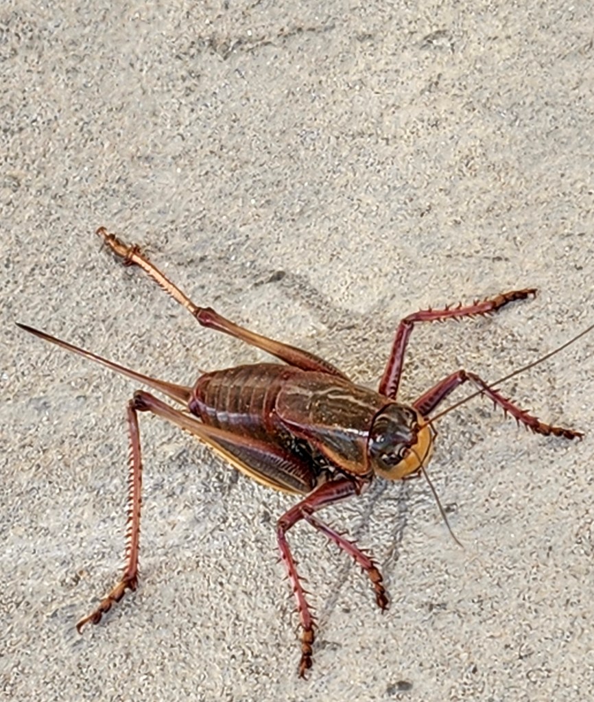 These creatures ( aka – katydids or Mormon crickets) greeted us in Elko and also in Austin. They literally cover the road and make it look as if it has become an ugly red river of some sort. We saw signs in Elko that said to be careful of slick roads because so many has been run over. I don’t think they bite but they are scary looking, eat all they can and crawl over everything. I saw a few that were maybe two inches long. Ick! This one is a female.