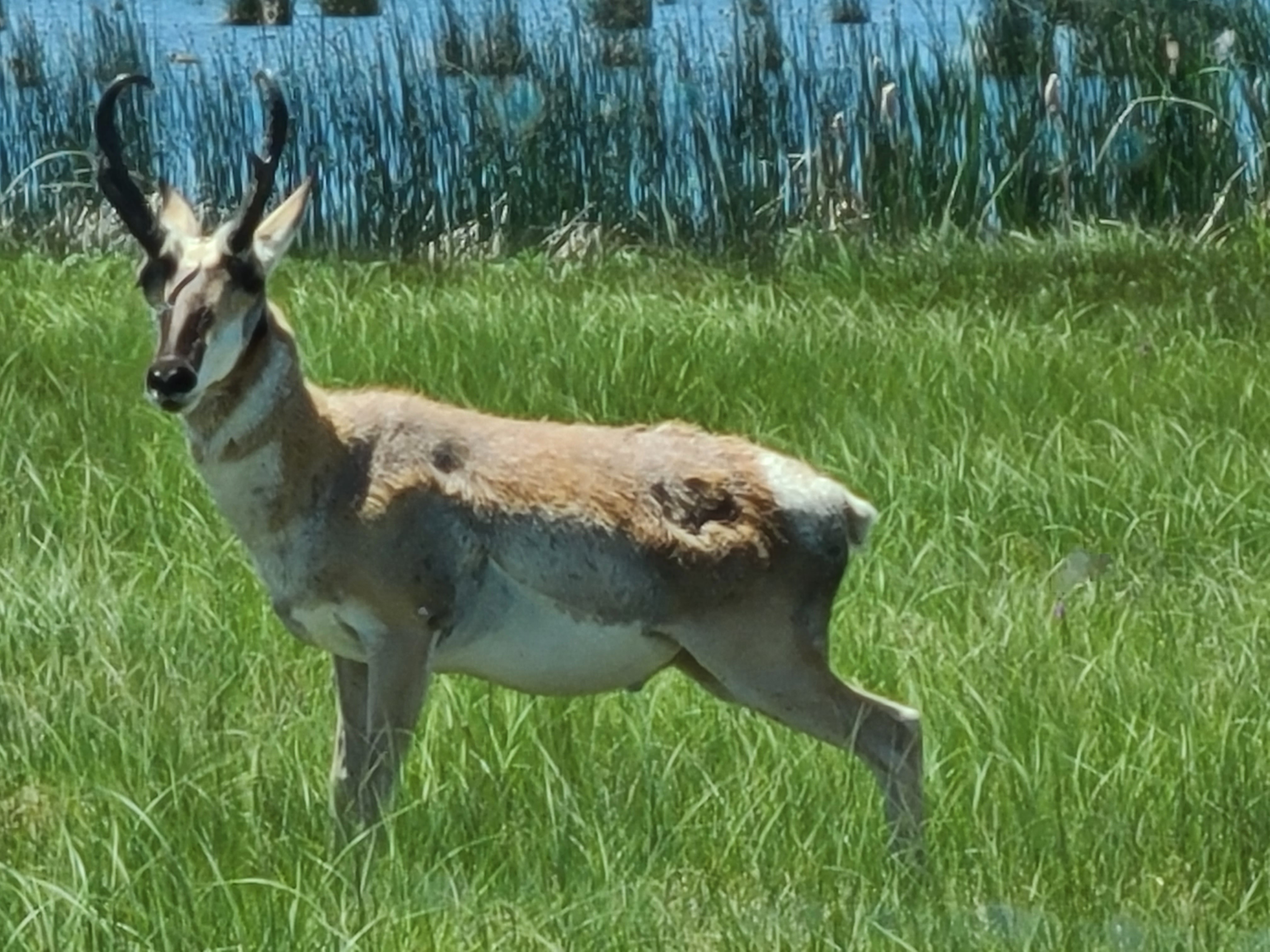 This pronghorn stood and posed for us for quite a while. This was taken from inside the truck because we were besieged with mosquitoes.