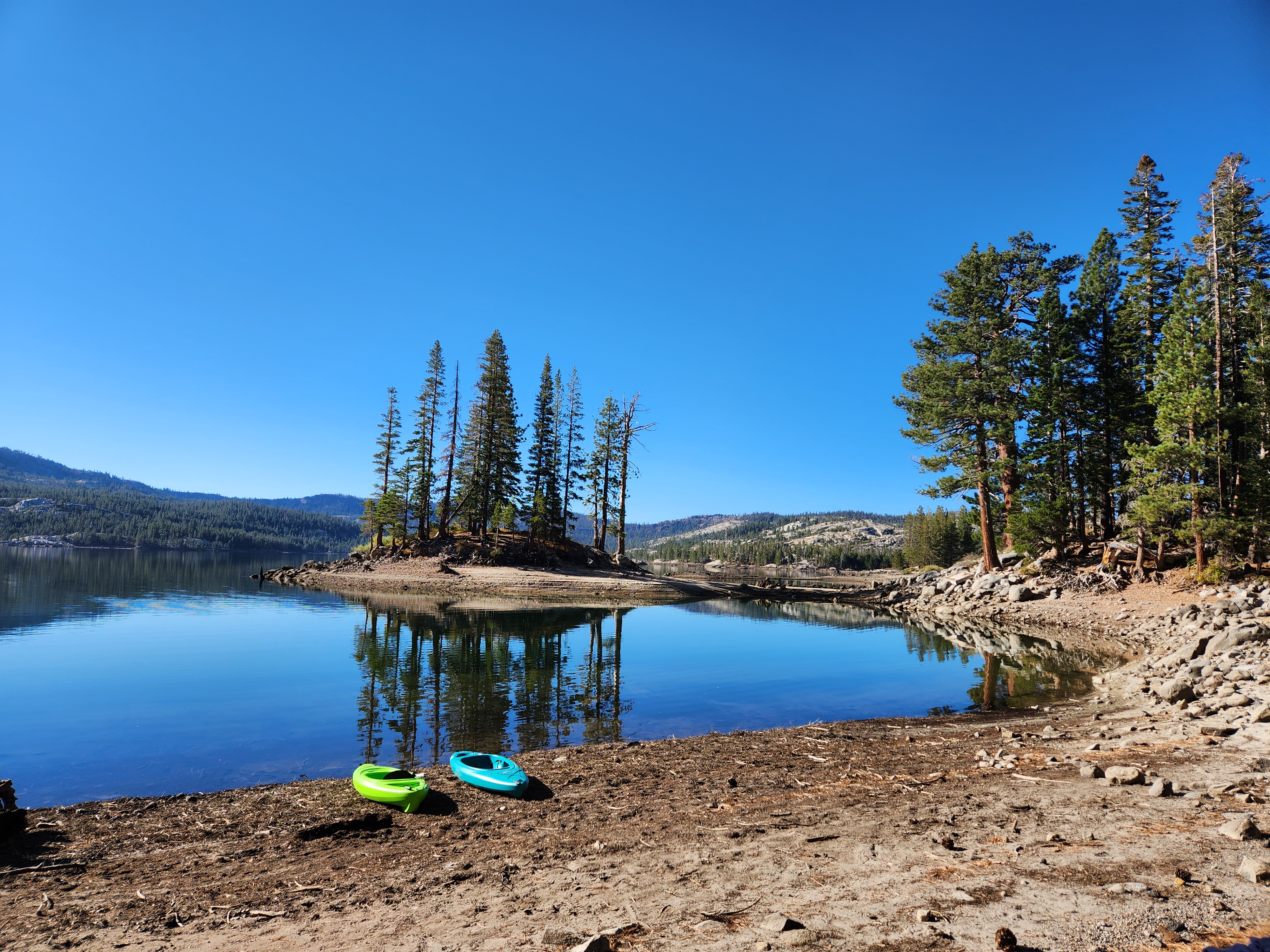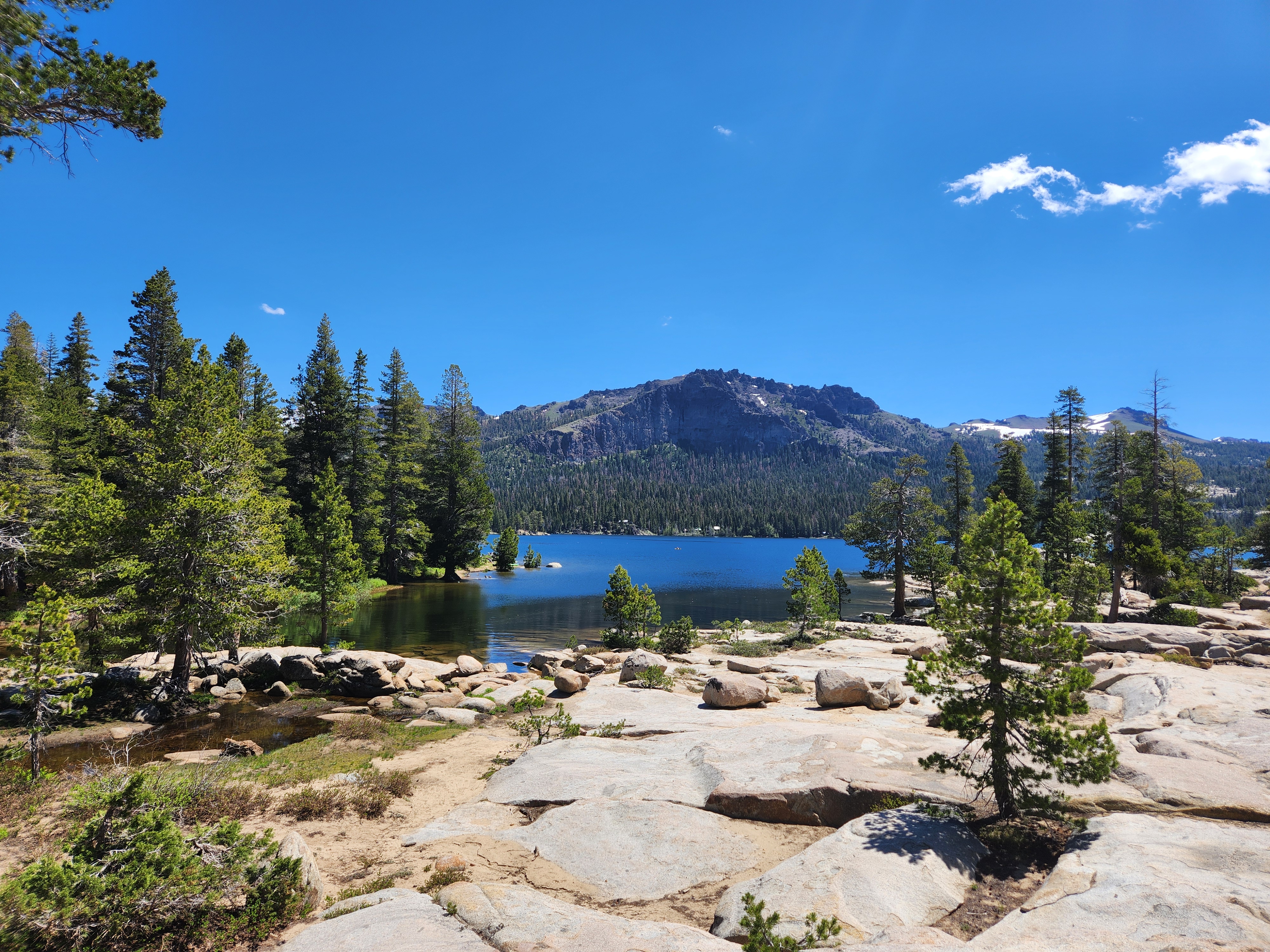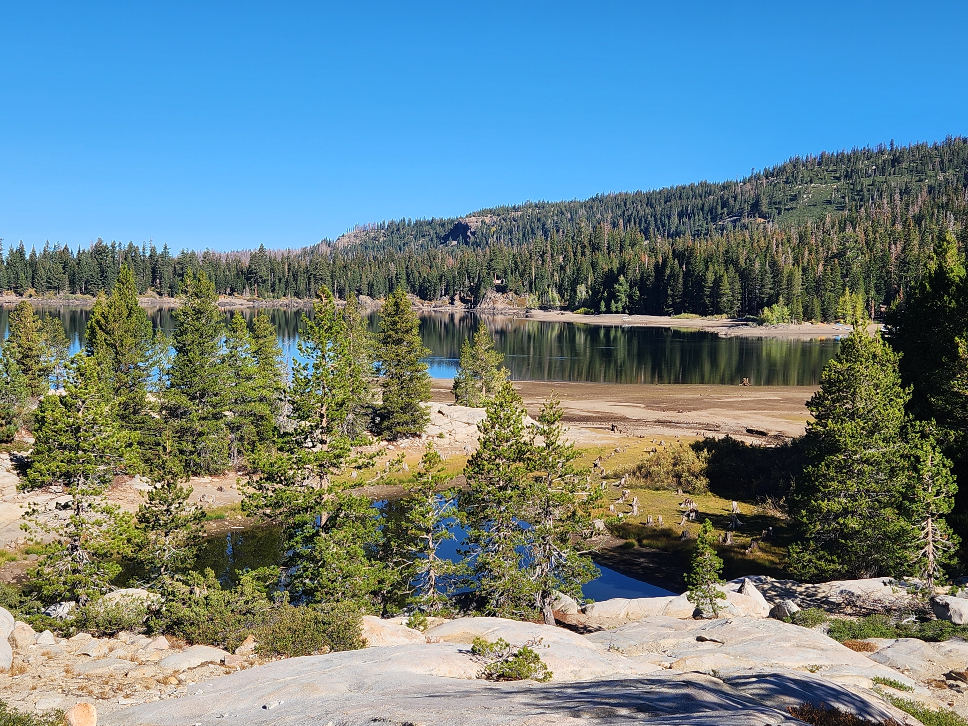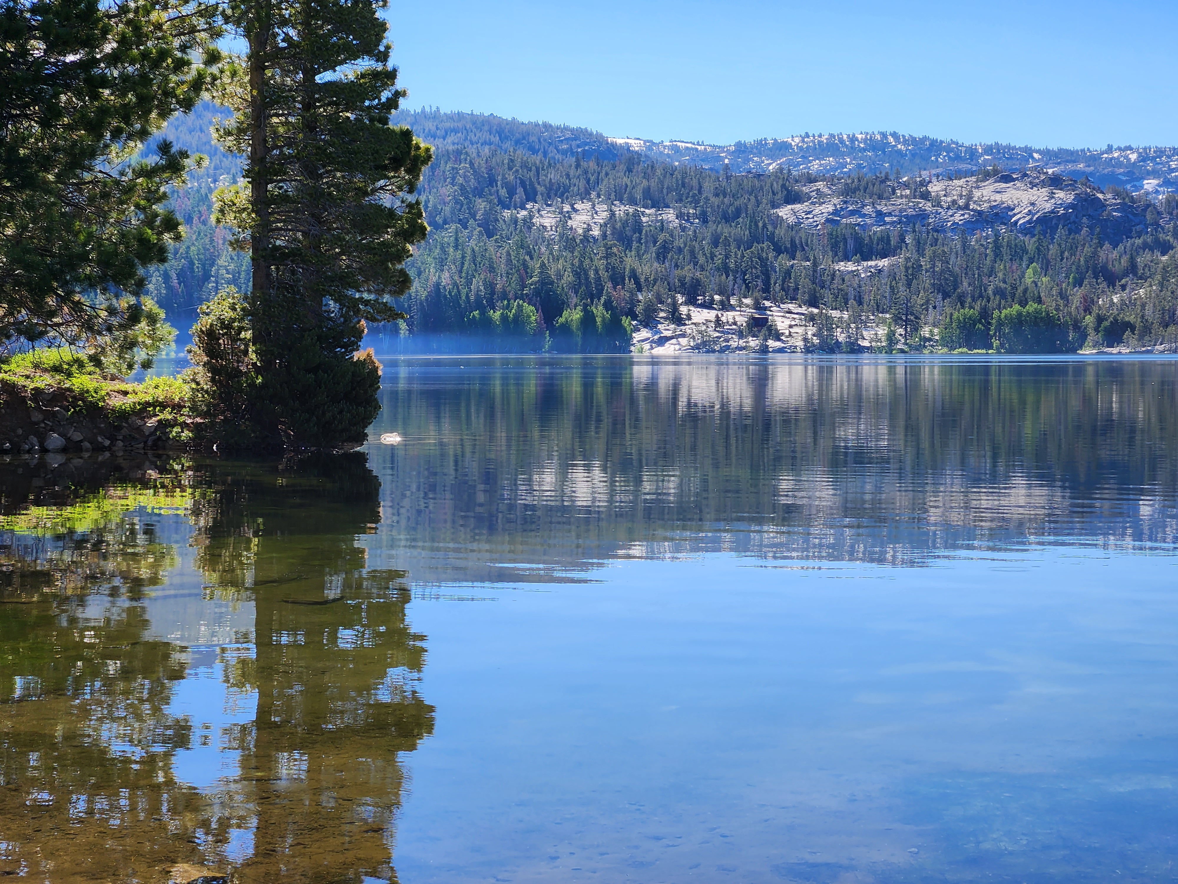 Silver Lake with some water going out the dam. Technically, Silver Lake is part of the El Dorado Water Irrigation and Recreation Areas that stores water for thirsty Californians.  Logically, the lake level goes down as the summer wears on.  For you techies, the lake is at 7200’ elevation and, when full, covers about 525 acres.  Its outflow is the South Fork, American River.  Couldn’t find the depth, but I’m sure parts of it are 100’ deep