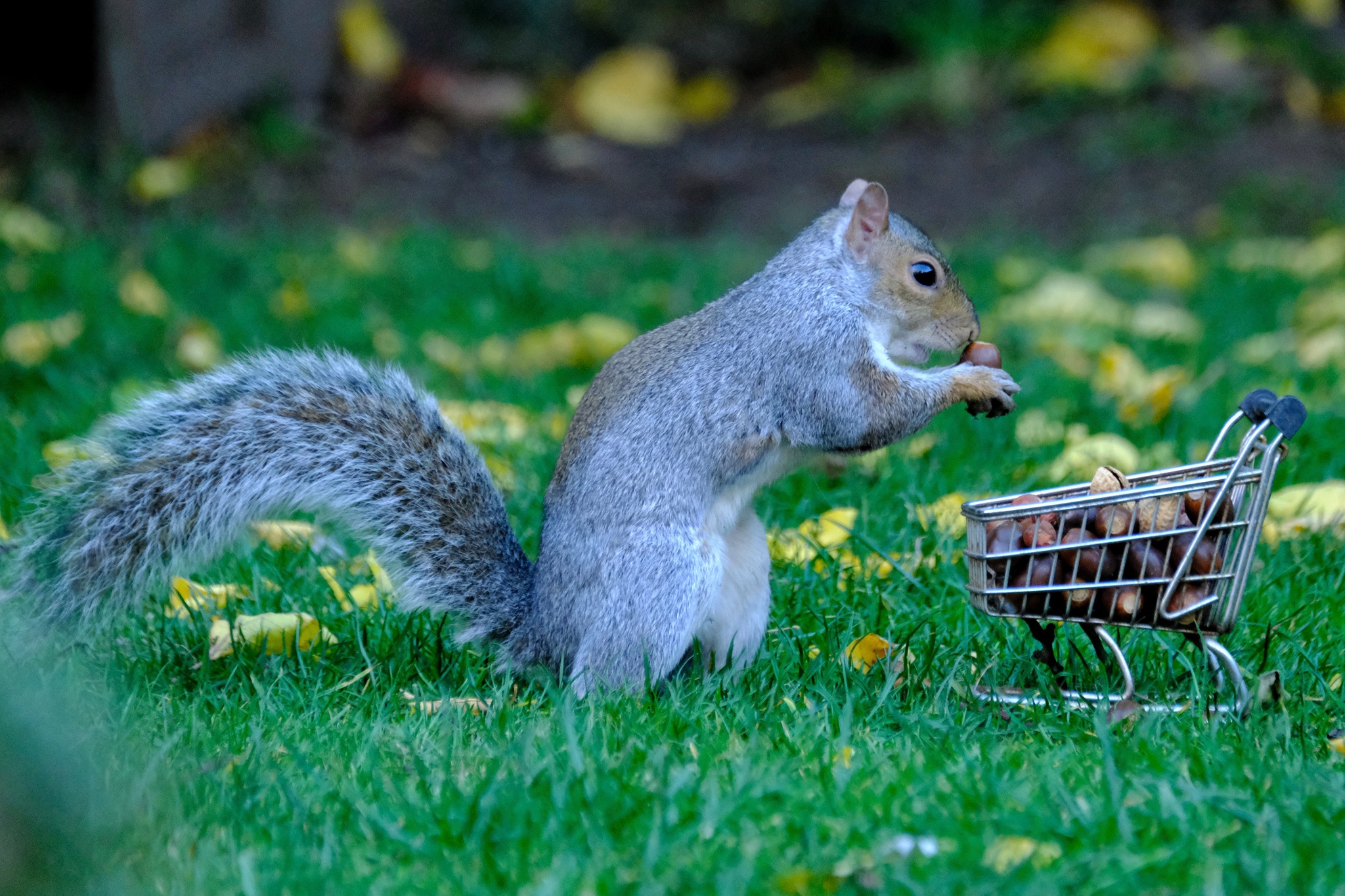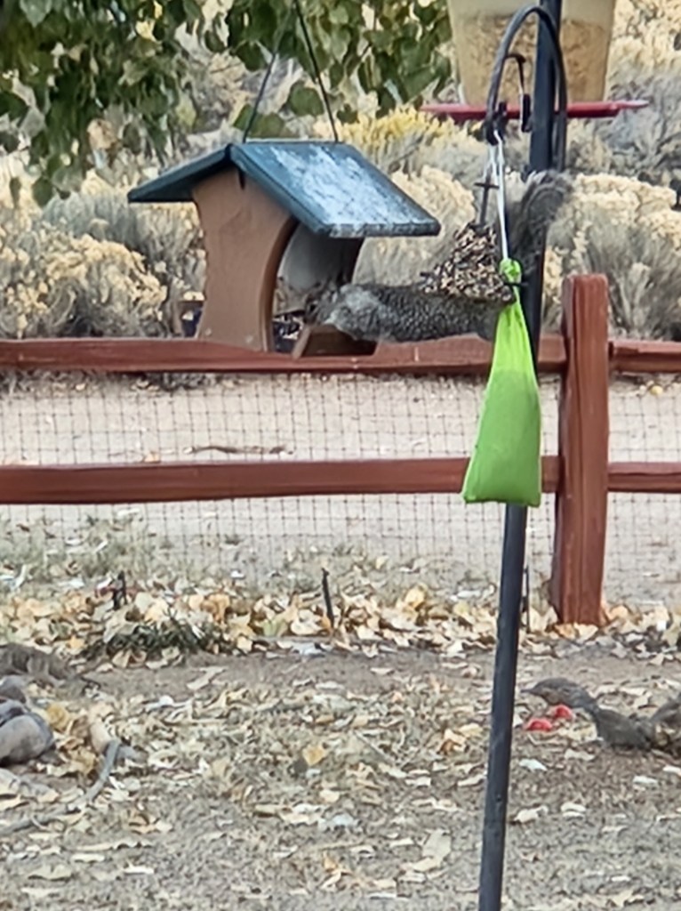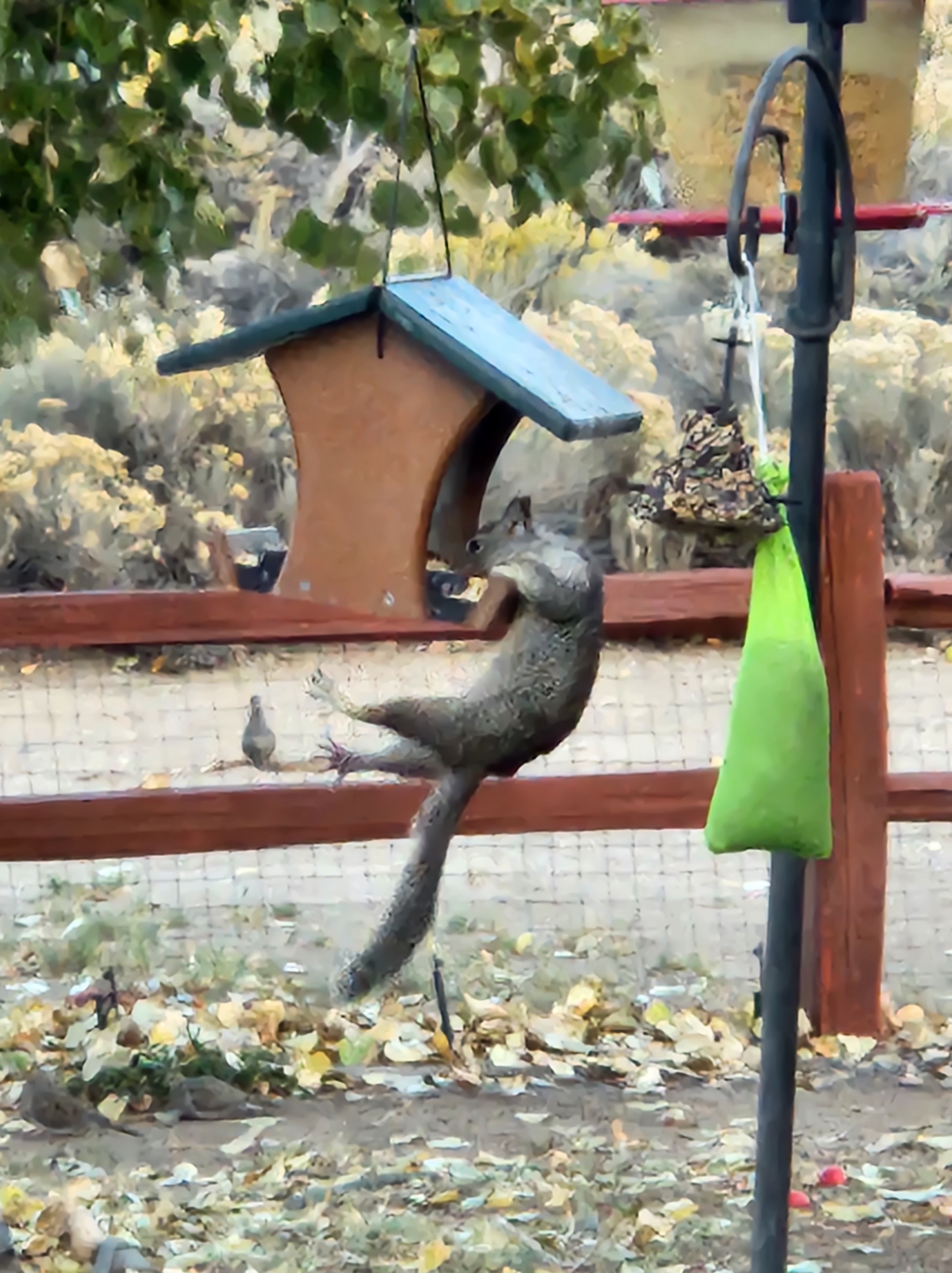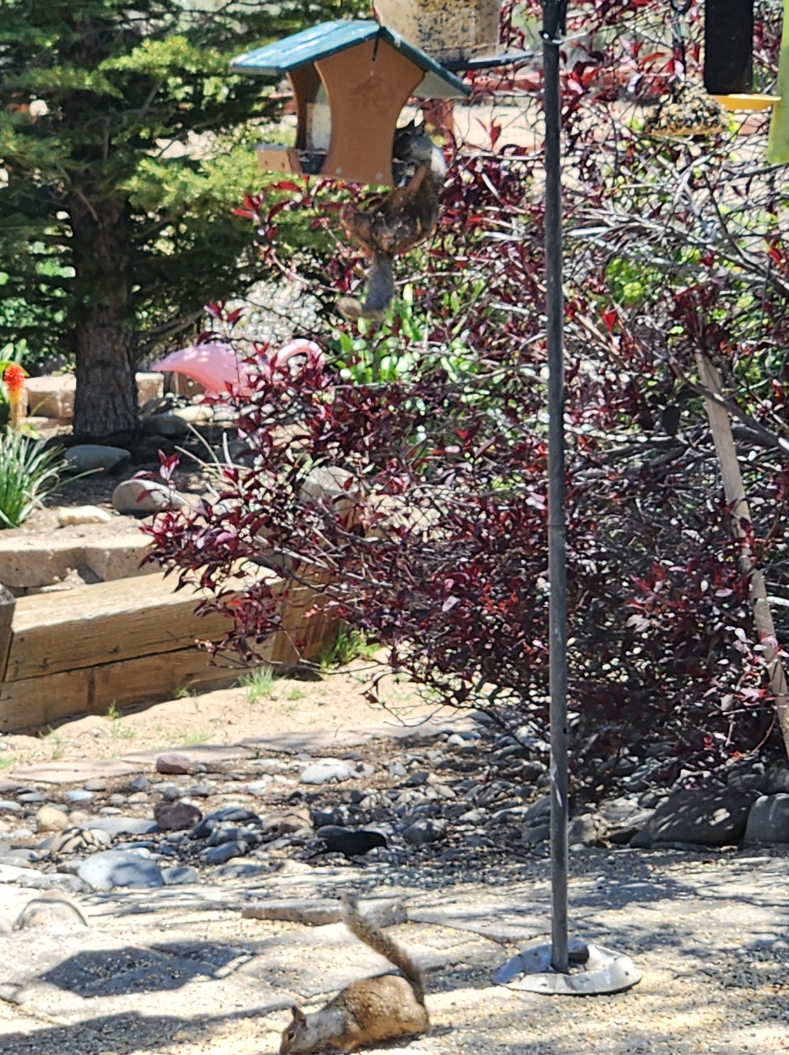 This is how my backyard squirrels think of my BIRD feeding area. Their own personal supermarket with a complete squirrel menu just for them. This is not totally true, though. There are no acorns here; just wild bird seed, suet, fresh water and occasional apple peelings from apple pie or applesauce creation. All my critters love this feast.