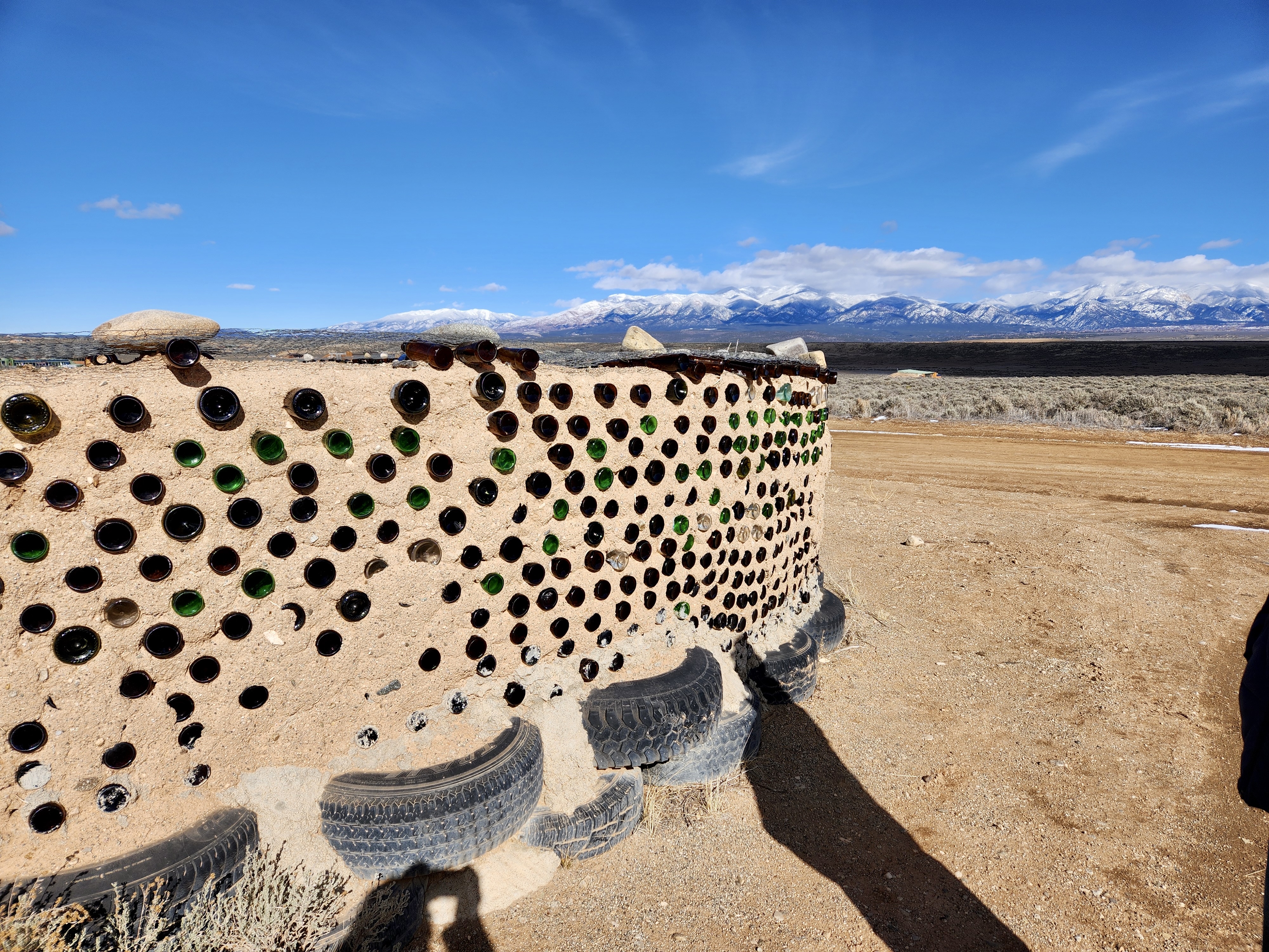 An Earthship wall.  If you’ve visited ghost towns around the West, you may have seen some bottle houses.  Maybe those old pioneers were into recycling before its time (except for the tires)