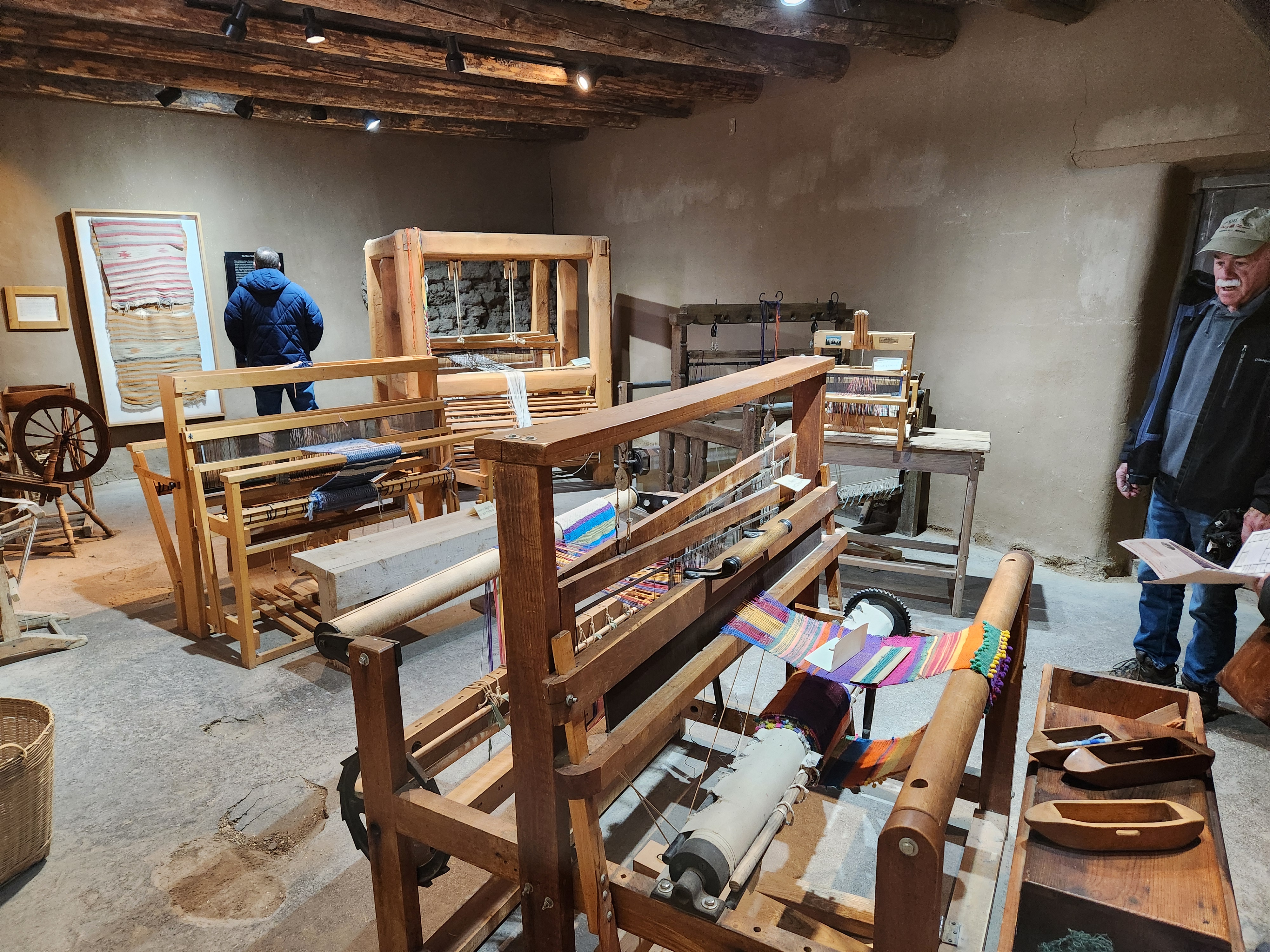 This is La Hacienda de Los Martinez, built in 1804 that eventually contained 21 rooms and two placitas (courtyards).  The two-foot-thick adobe construction and windowless exterior walls was designed to serve as a refuge for family and neighbors.  In a sense, it was like a small fort, containing living quarters, blacksmith shop, weaving room, chapel and other needed areas.