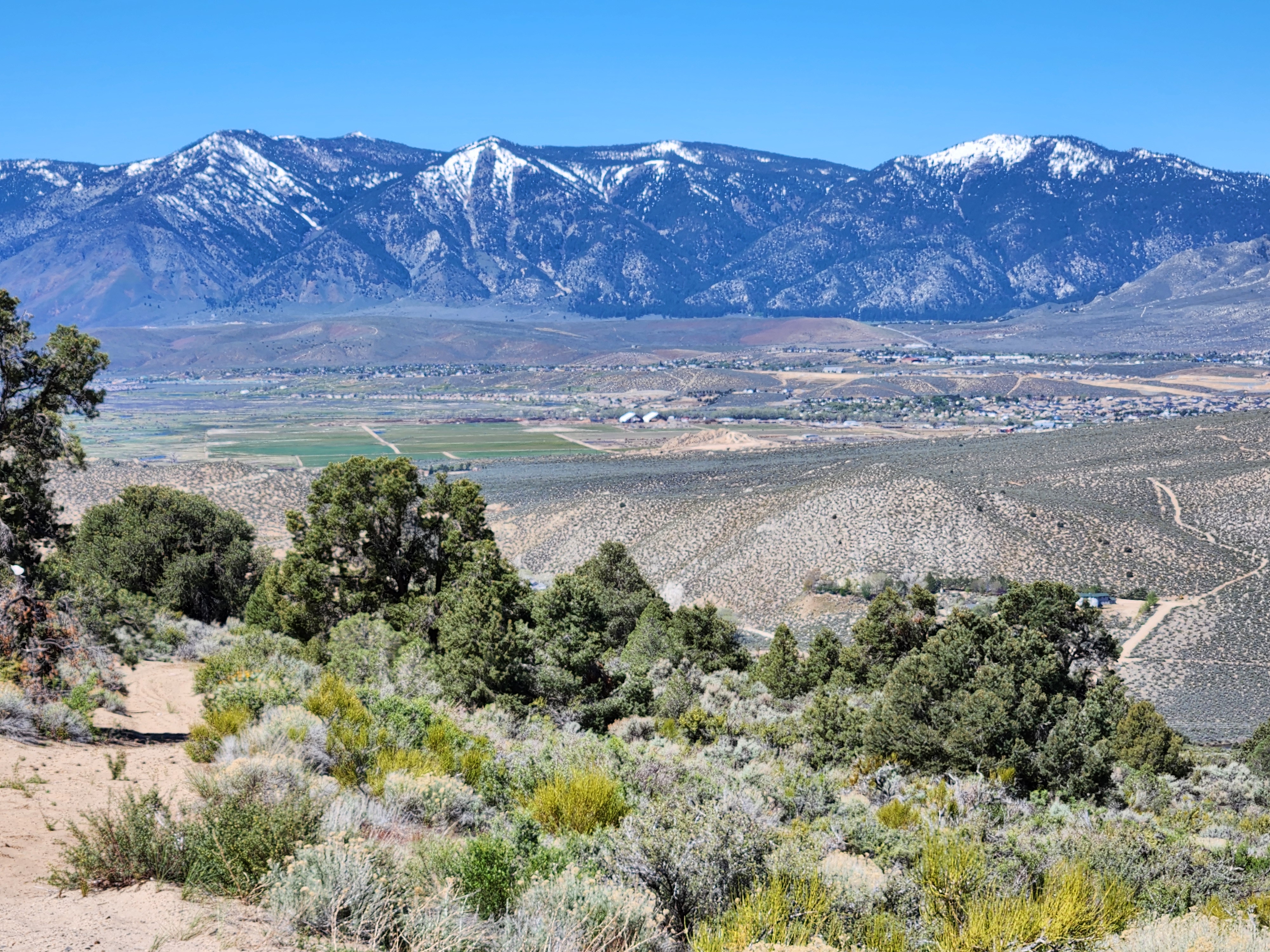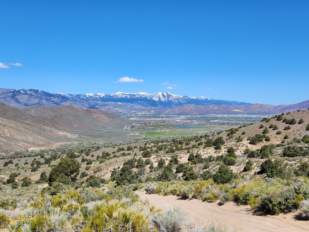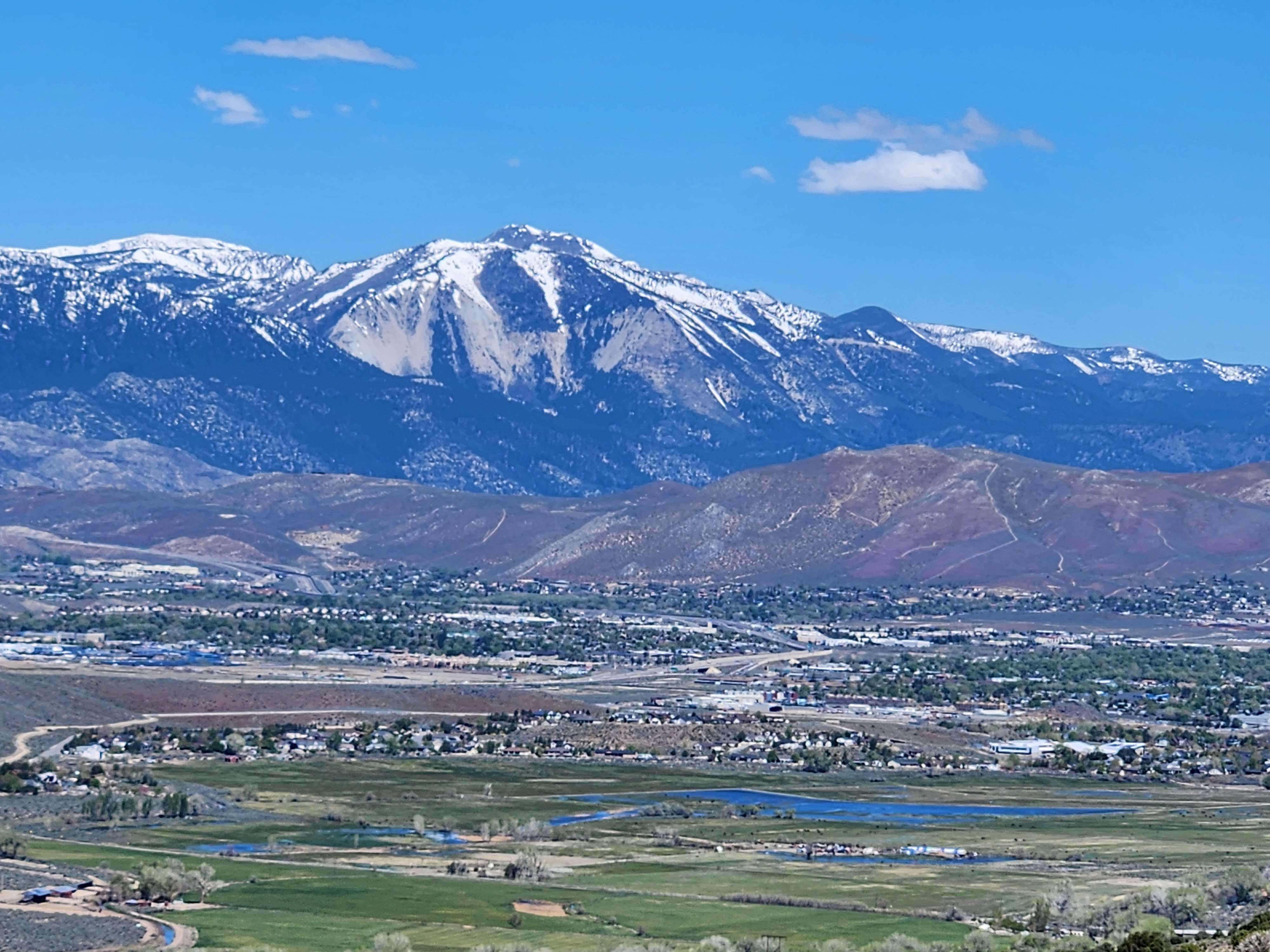 The morning after their arrival, we took the long way to Virginia City in hopes of seeing wild horses. We saw only two, but that was okay. This view is from Geiger Grade with Mt. Rose above Kate’s head.