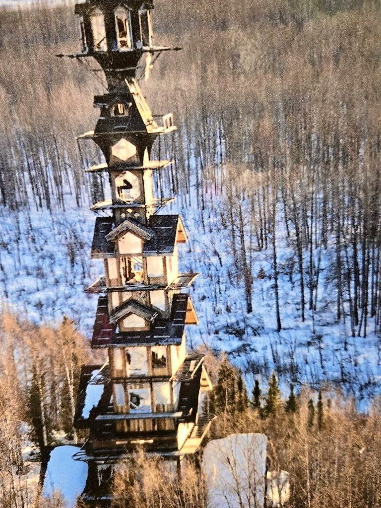 The Goose Creek House, aka, The Dr. Seuss House. Still unfinished, the owner wanted a house from which he could have an observation deck that had to be above the trees. It’s now 185′ tall and unoccupied. It takes all kinds, eh? (copied from another photo)