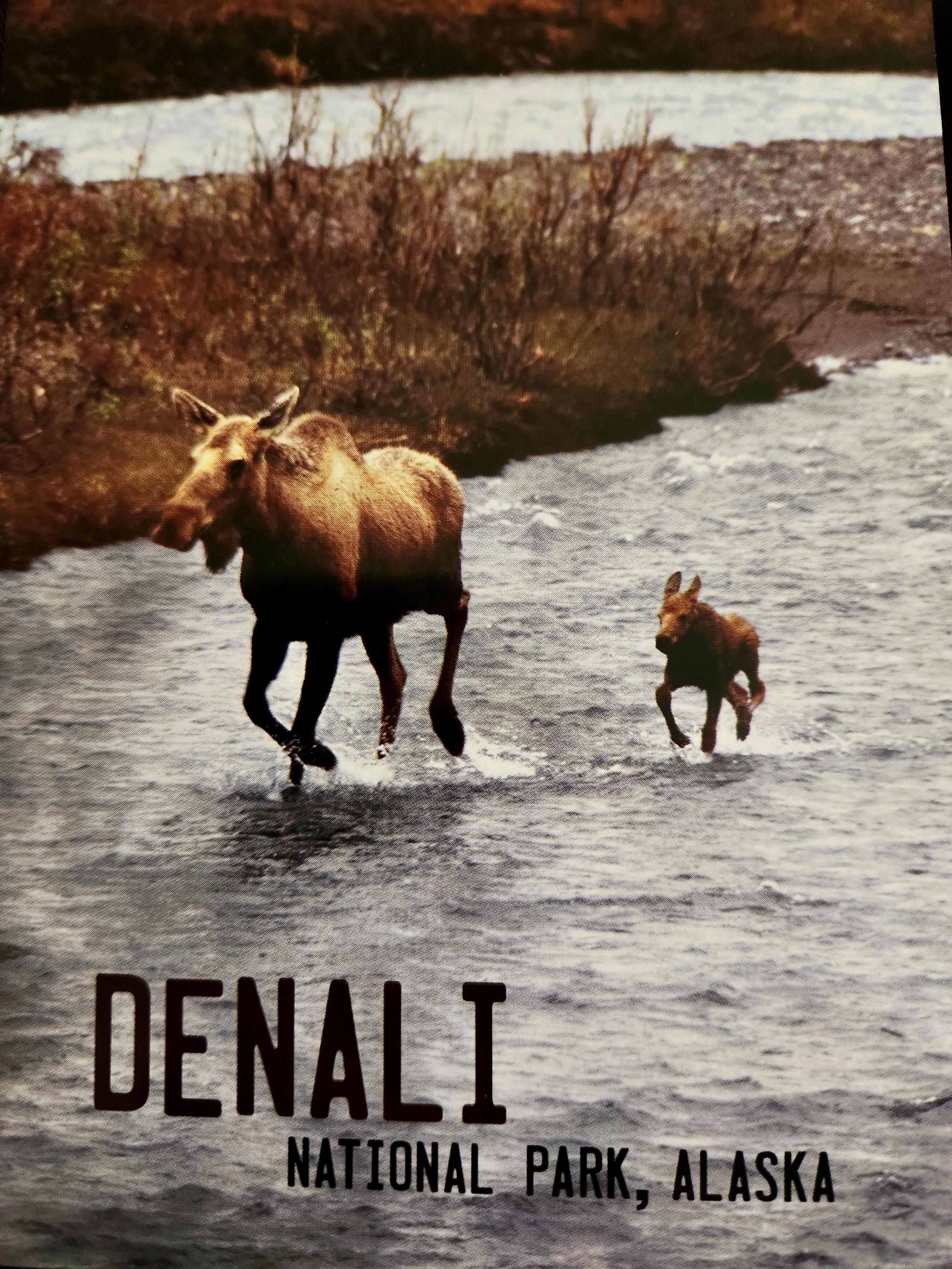 We never saw a live moose, but I really liked this post card. We were told they were all around us, but I don’t think anyone saw one except when we toured a wildlife center. Even then, Jerri and I missed them. That’s the bummer about being on a tour. One has to leave when the leader says so. 🙂