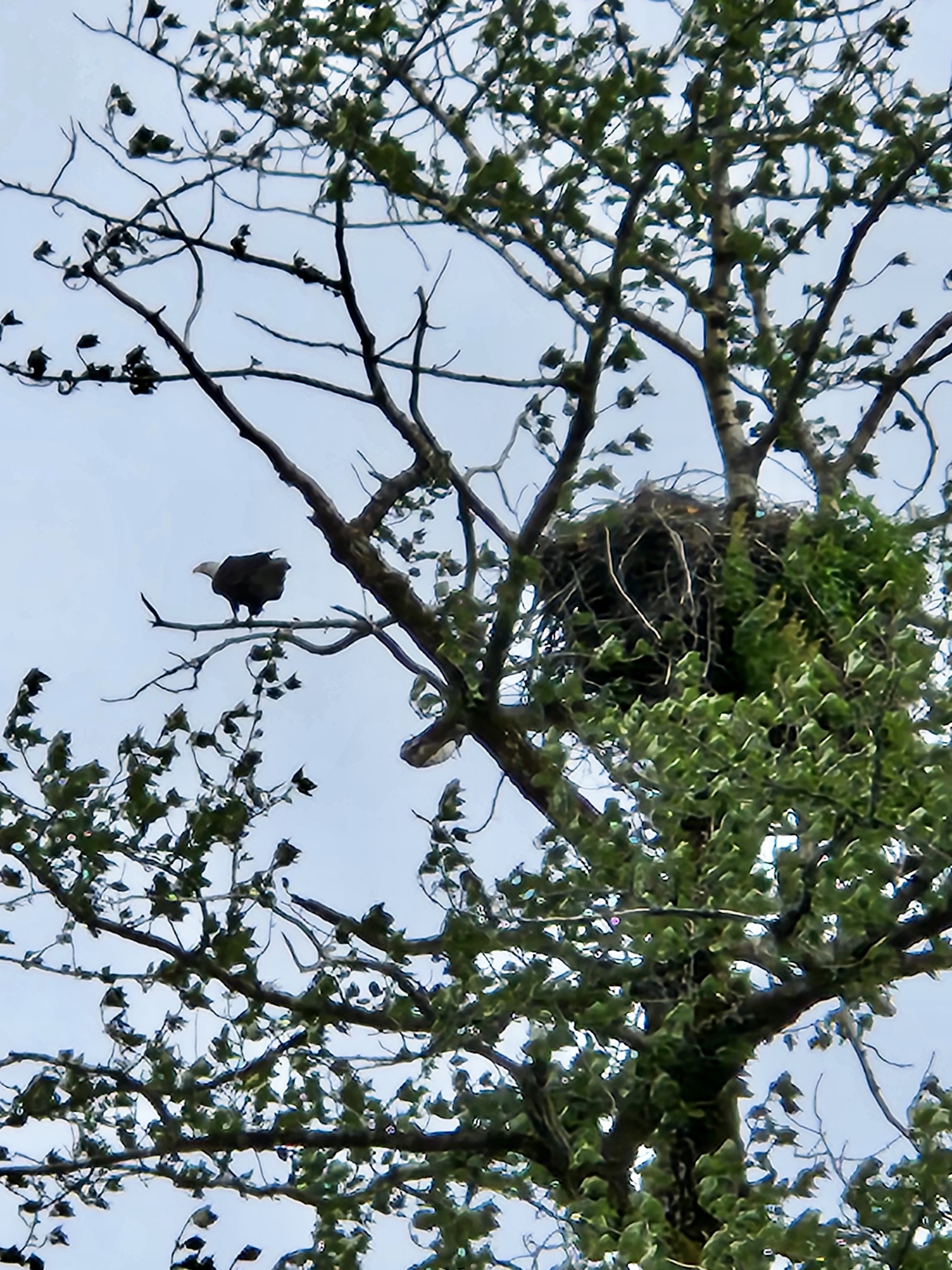 The eagle getting ready to fly to the above nest with a fish. Its mate is in the distance.