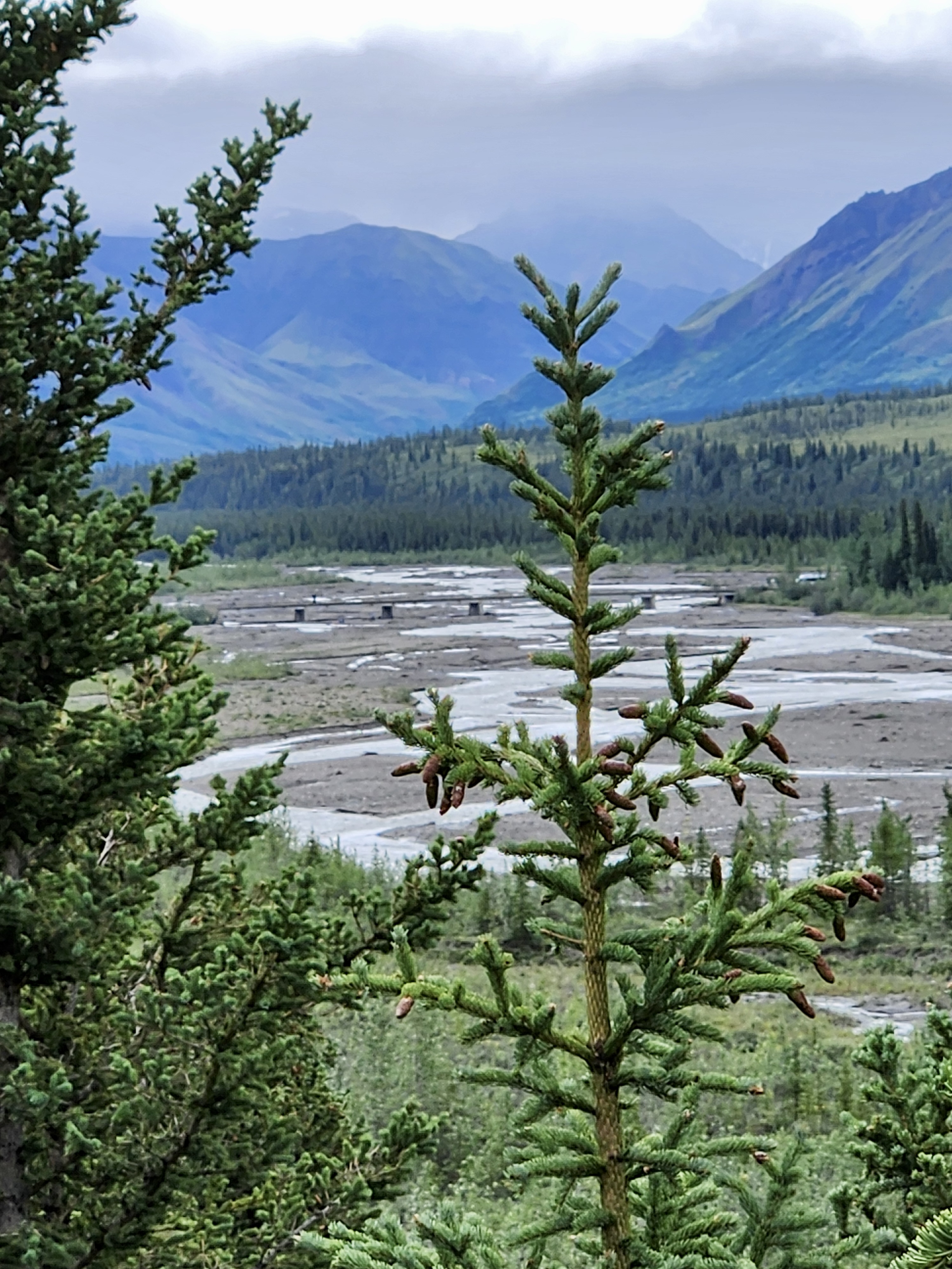 We took a park bus 43 miles into the park in search of critters, fauna and other wonders. I believe this is the Teklanika River, a braided river due to meandering caused by silt and debris from glaciers.