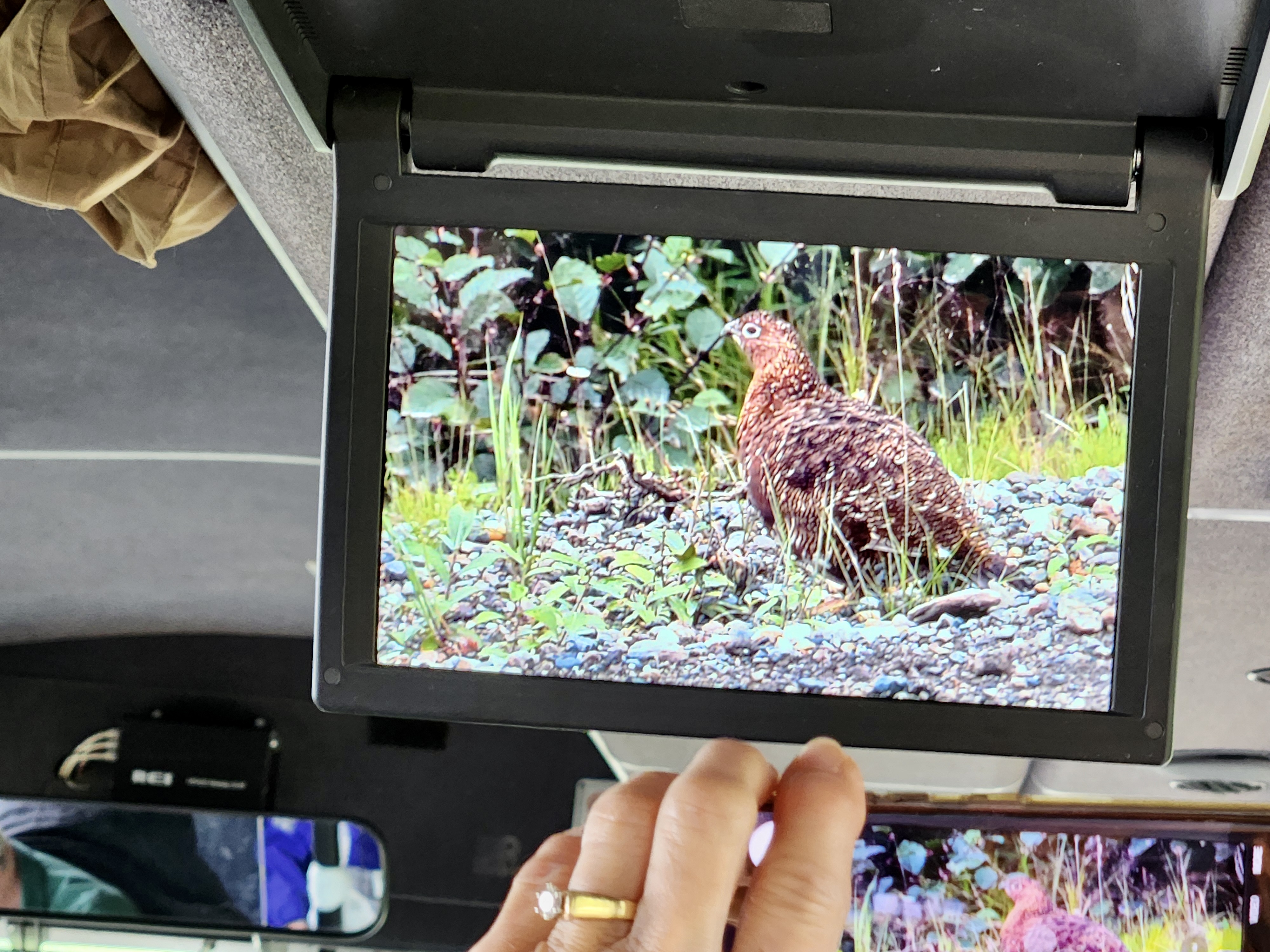 Our first critter, a ptarmigan, sort of like a grouse. The bus was equipped with a camera that zoomed in on the animal we were all trying to see. It was a good thing because then all of us got a chance to see something when standing bodies were blocking us. Shortly after that, we saw a fox kits playing in bushes, but they never slowed down to pose.