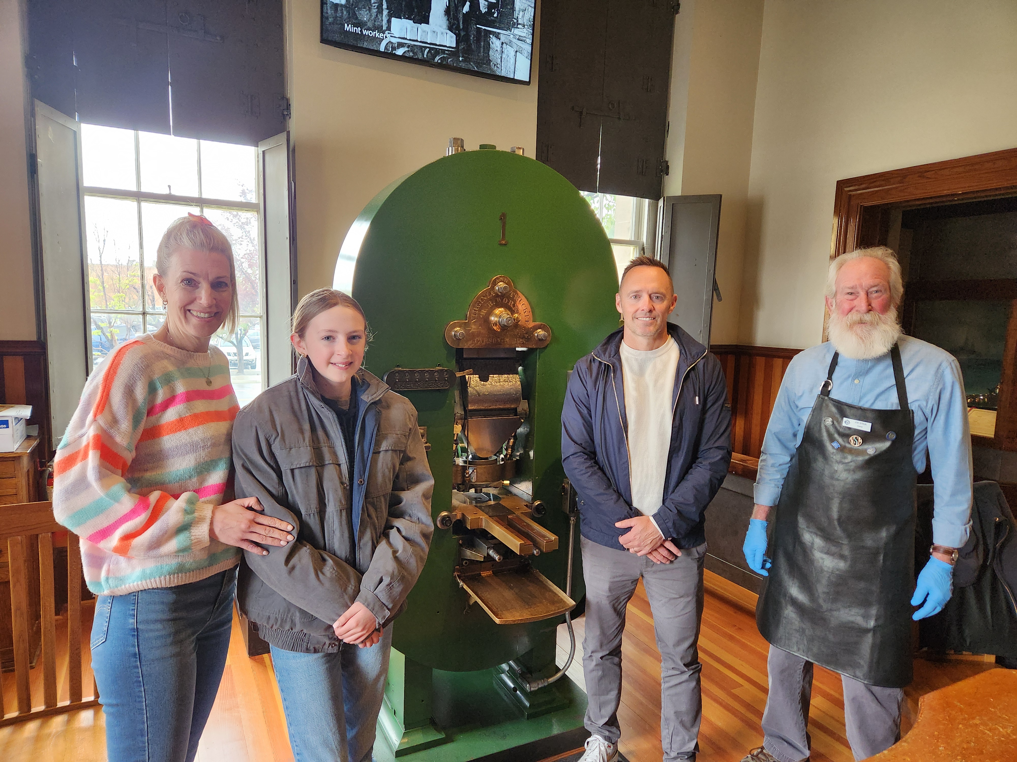 Of course they had to see the museum’s priceless artifact, the first coin press to arrive in what was then, the Carson City Mint (1869).  It’s the only coin press in the entire world of its vintage that still works!   Jim Spain, one of the coiners, was running it that day.