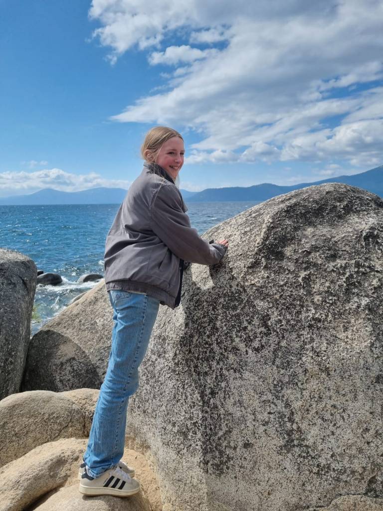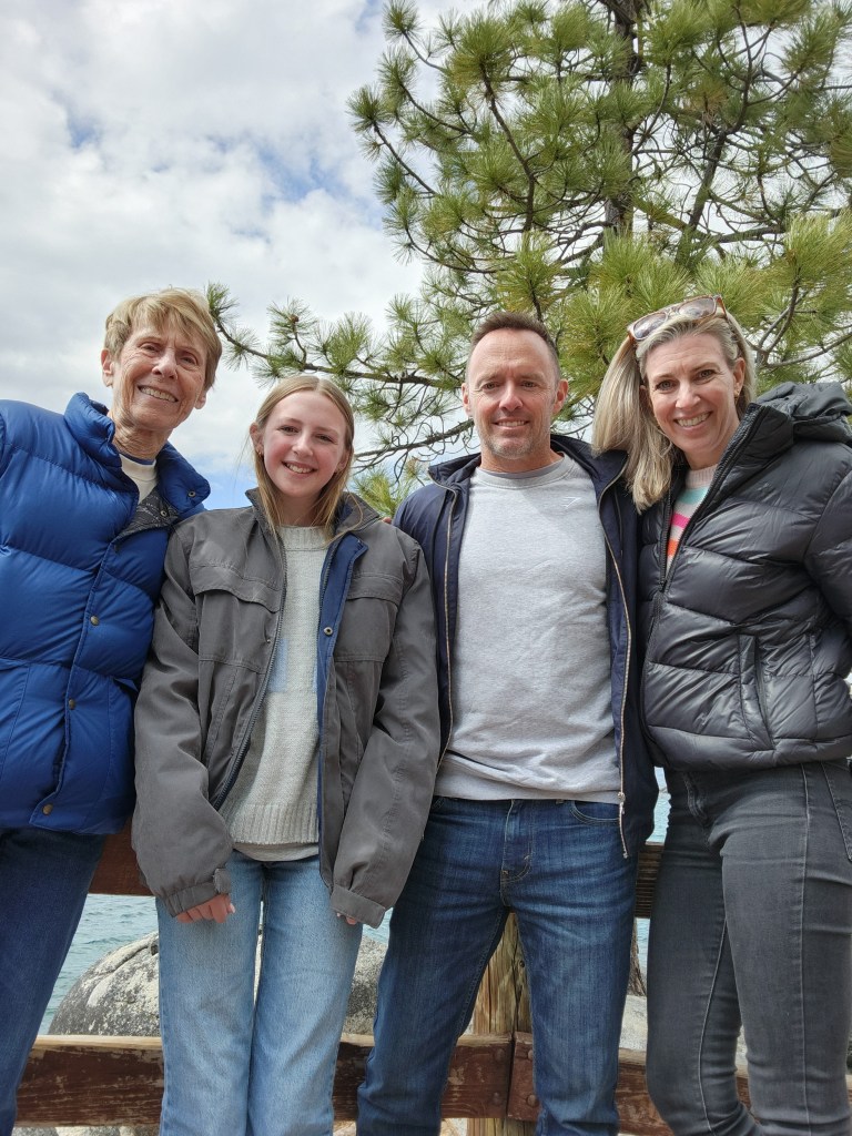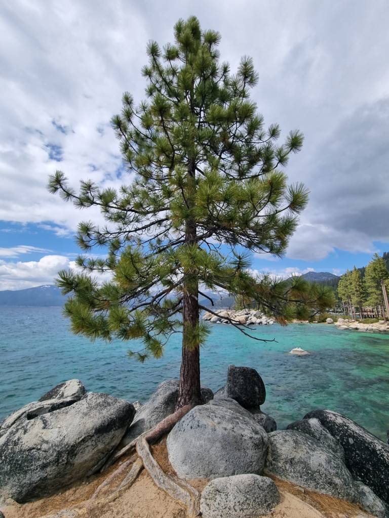 After lunch in VC, we drove over the Sierra Nevada to Lake Tahoe and stopped at Sand Harbor where the “family” tree is.  This is where Bob’s and his mother’s ashes as well as my parents’ cremains are.  Michael and Bob were very close while he was living with us and going to school. Bob was also best man at their wedding. Michael thought it only right to visit Uncle Bob and Grandma.  It was special to me, too.