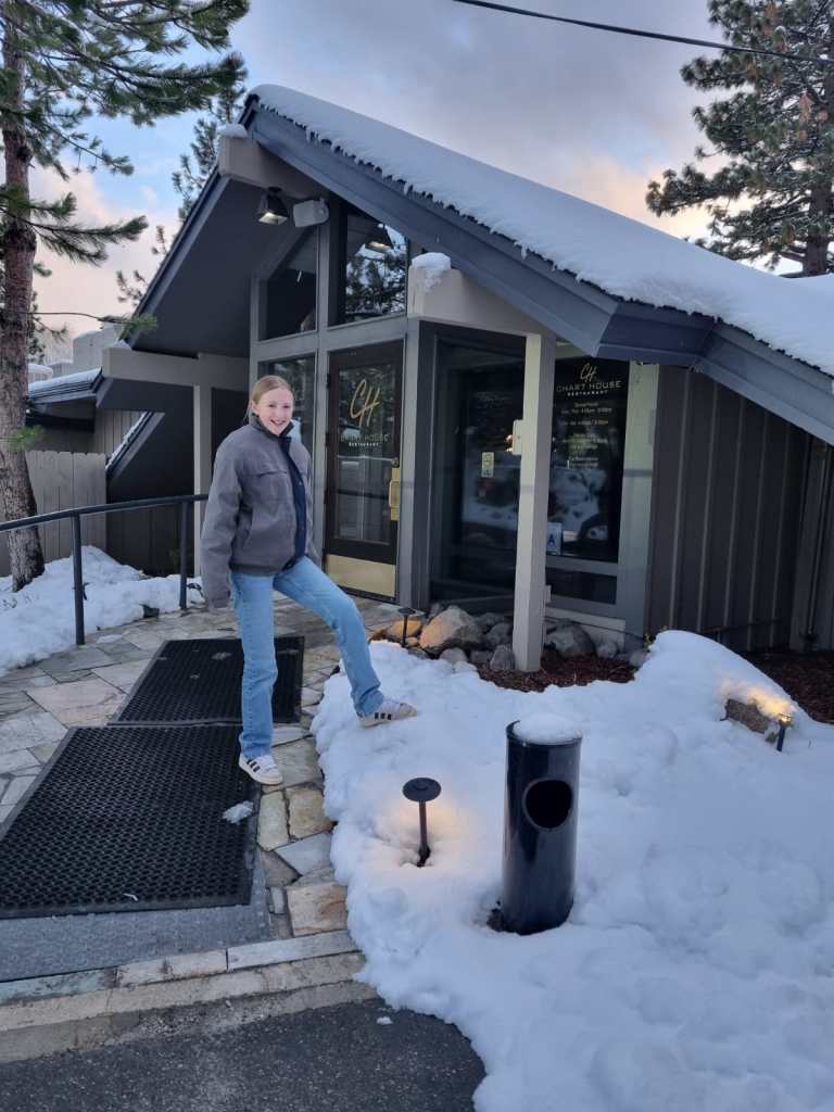 Dinner was at the Charthouse above Lake Tahoe.  It had snowed quite a bit that day and Kate enjoyed the beauty.