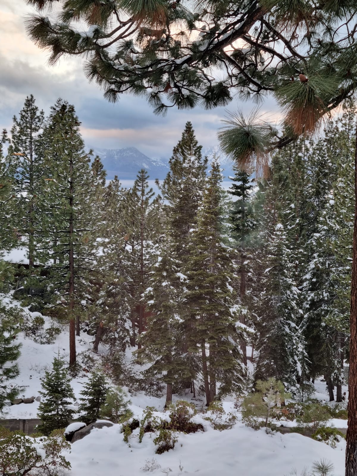 Lake Tahoe from the Charthouse.  You can see the water along the bottom of the far mountains.  The snowy trees made us think of Christmas.  Love the Lake in all seasons!