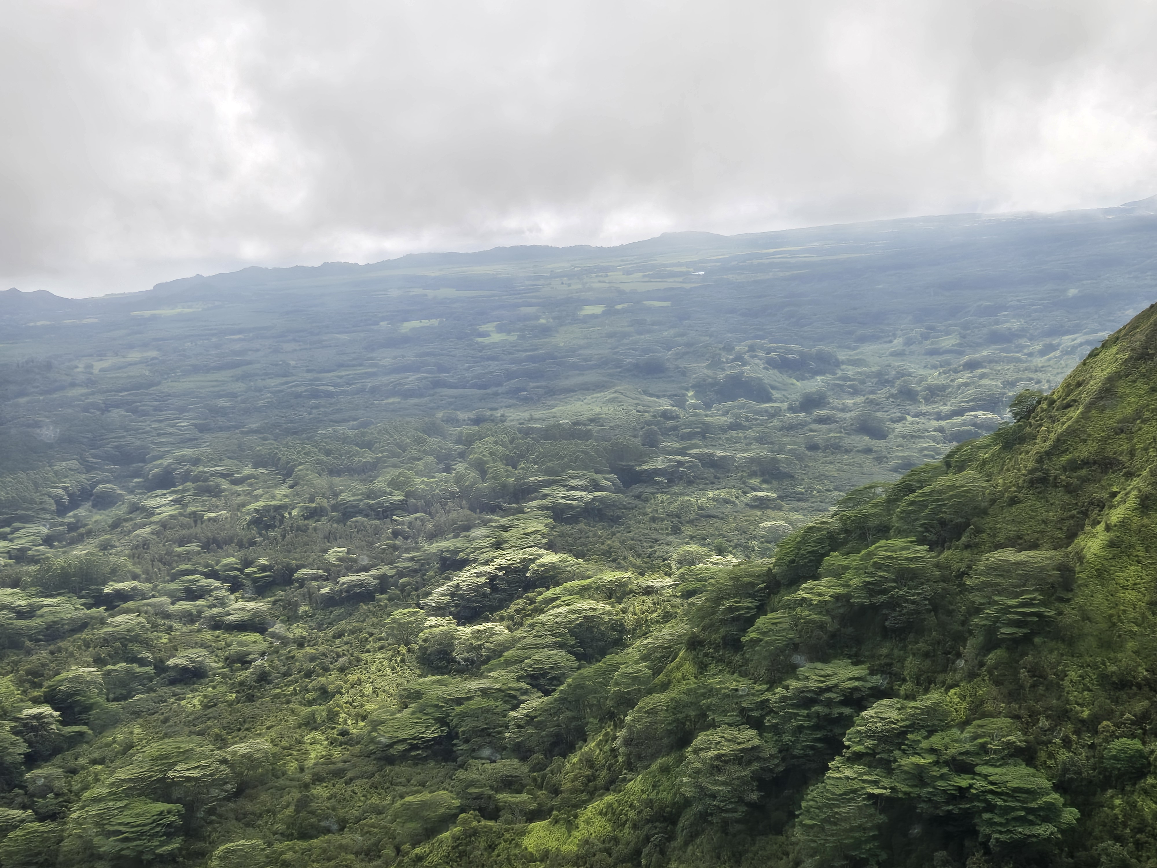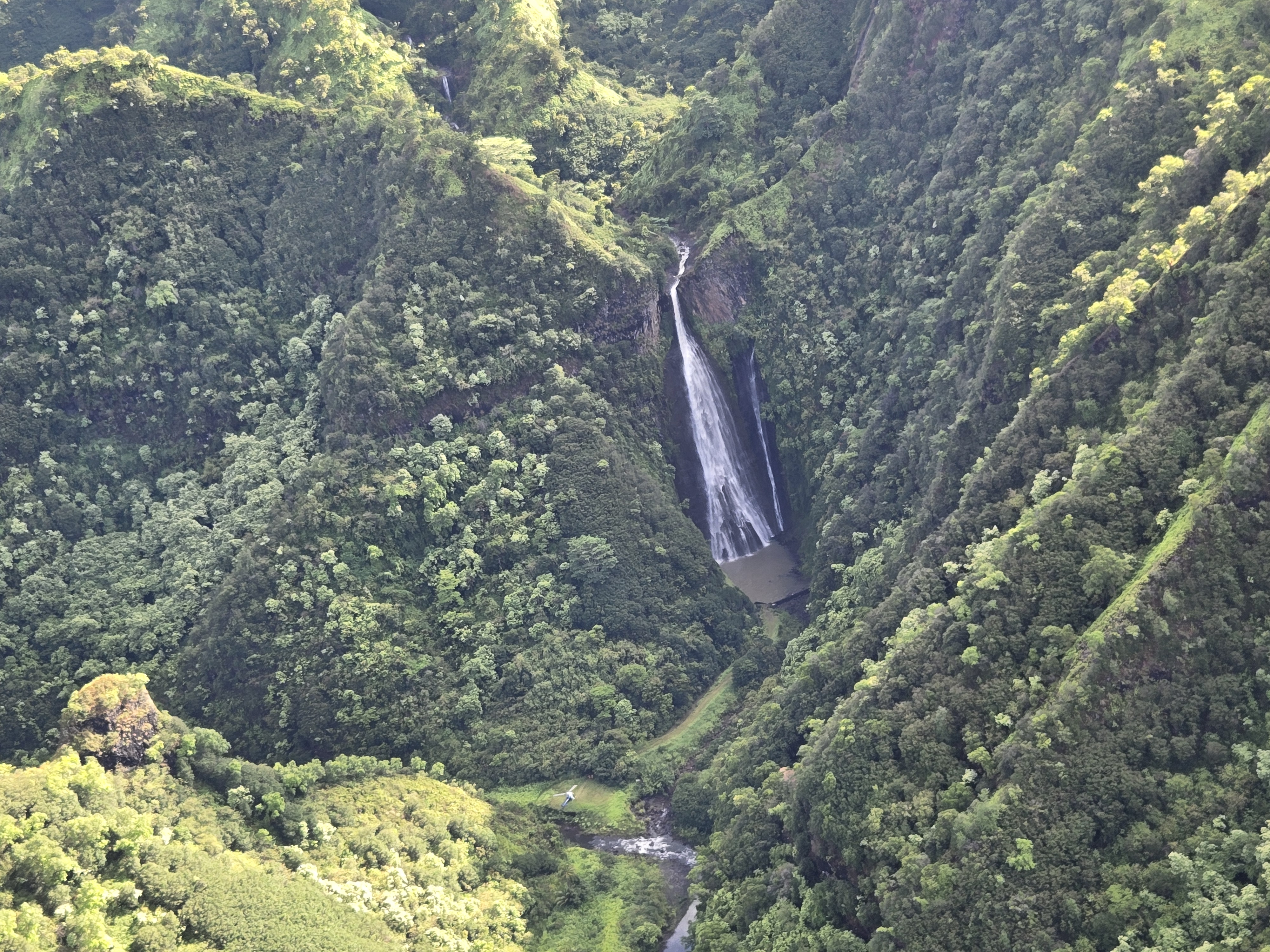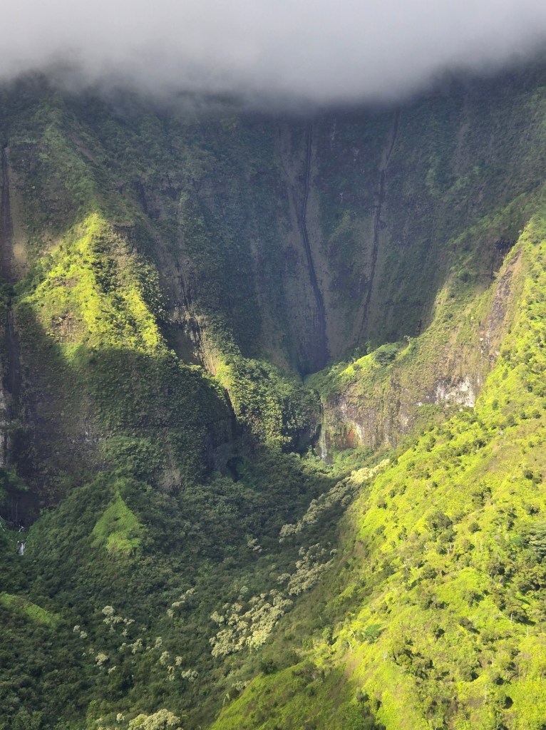 Inside the almost spiritual splendor of Wai’ale’ale Crater, over 3000’ high with rain clouds covering the crest.