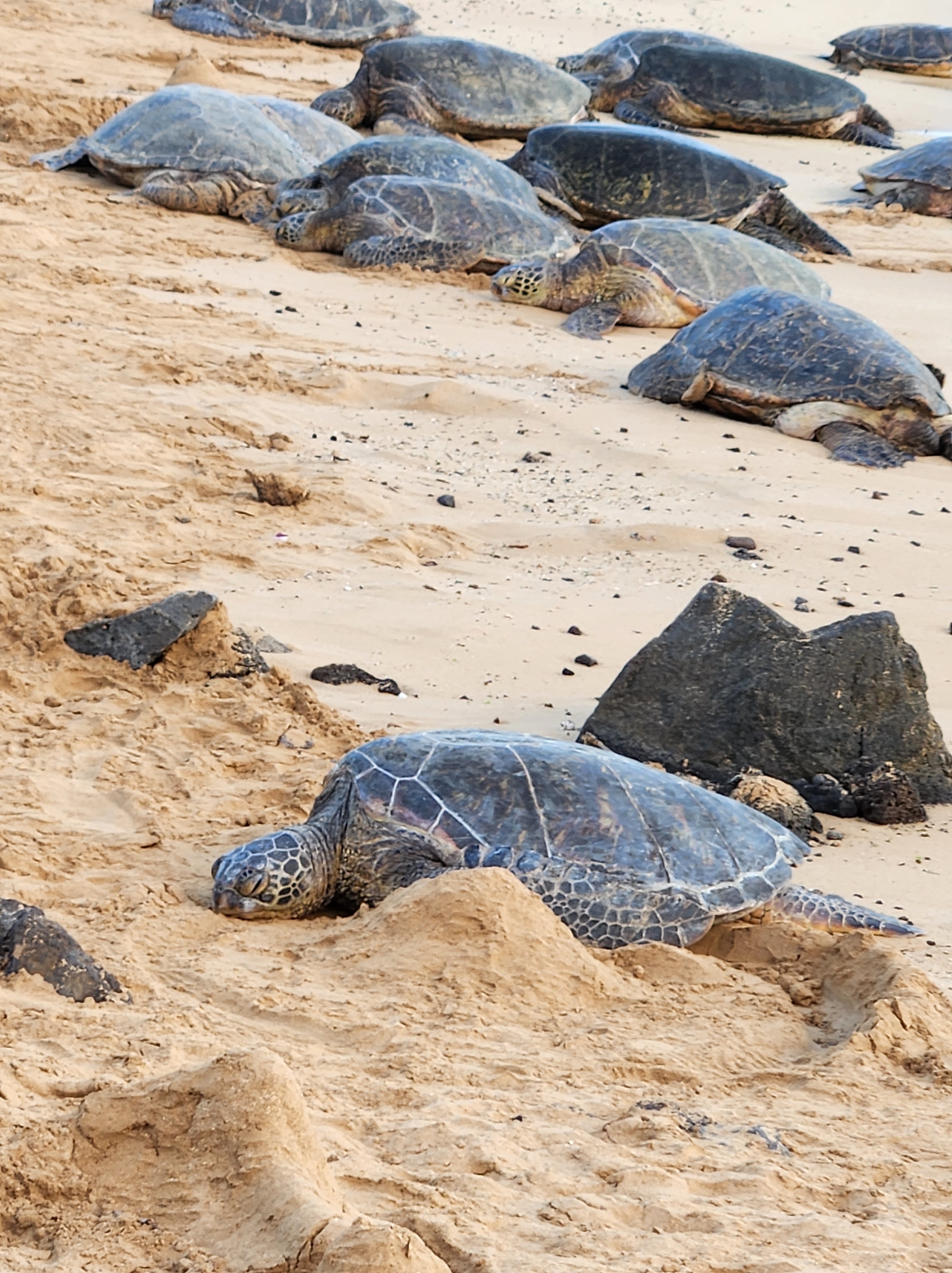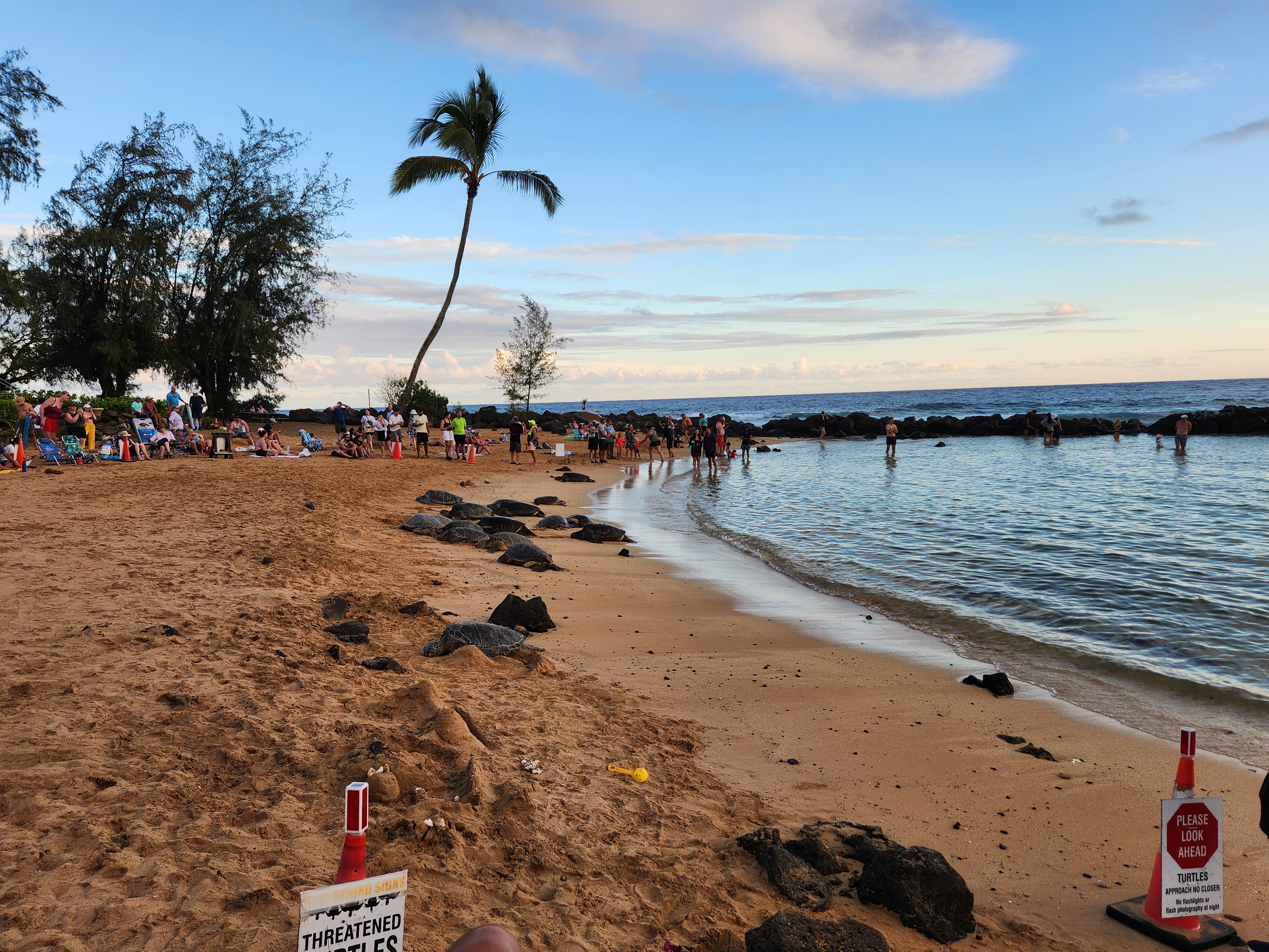 Every evening, green sea turtles beach themselves at Poi Pu Beach to rest for the night.  This is not a usual occurrence at other beaches, so many people flock to this beach to watch them.  We joined the crowd.