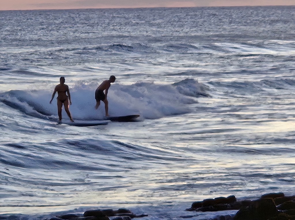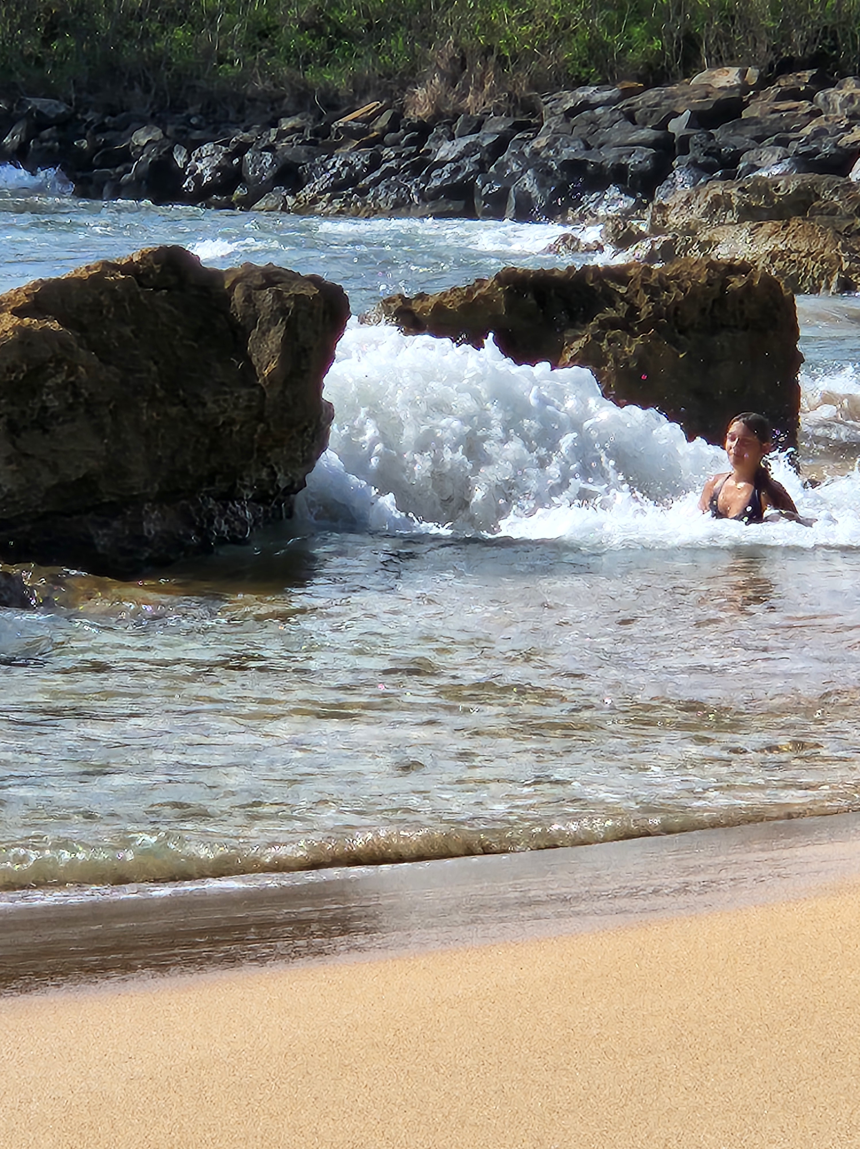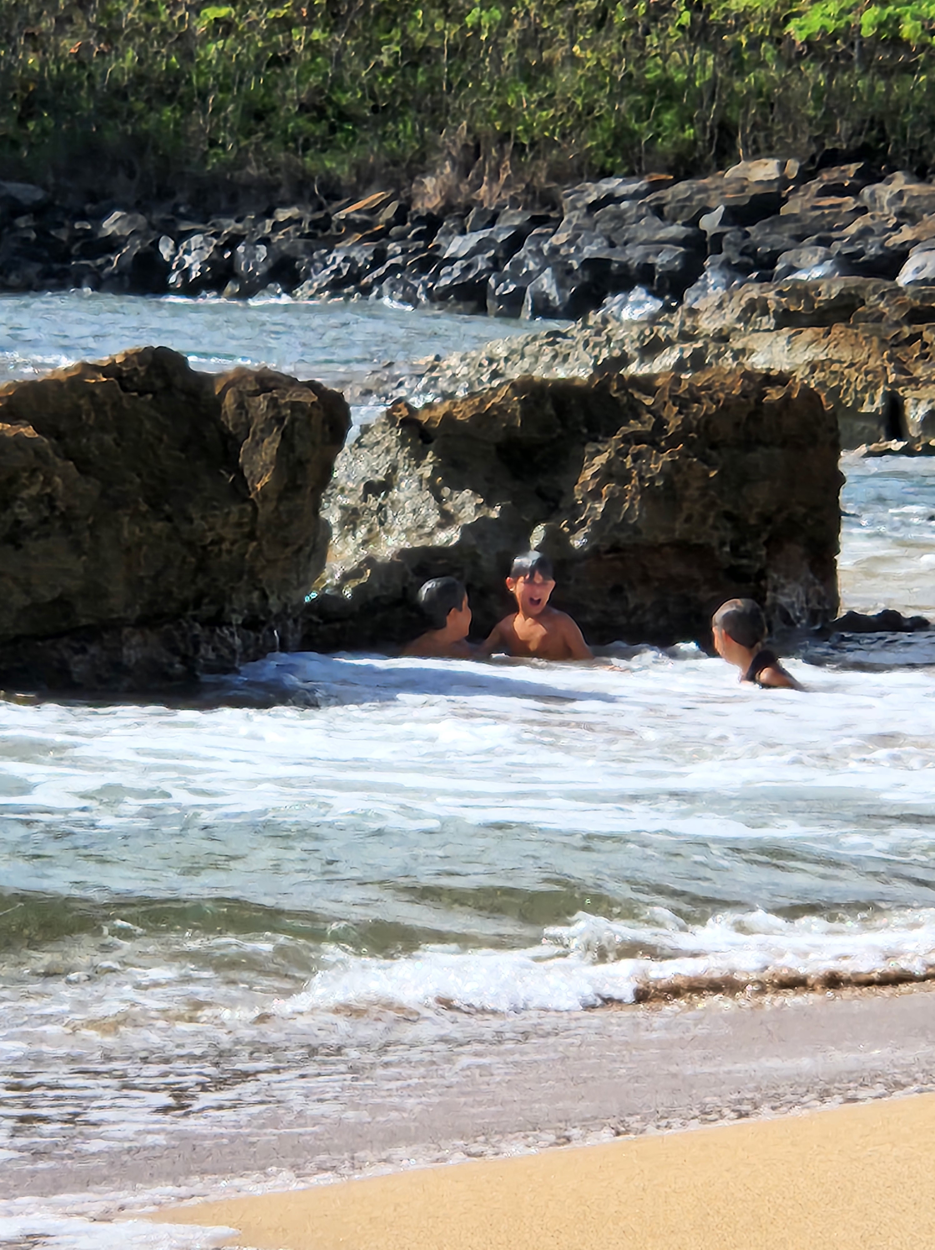 We discovered a small boat harbor that afforded nice snorkeling in calm water.  There, we saw eels, various fish and some keikis having a blast playing in the water. Here, they are waiting for a wave to come between the two rocks.