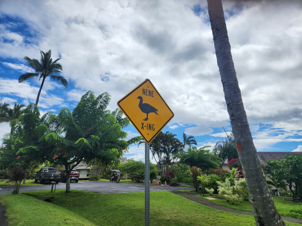 As we were driving through Princeville, an exclusive community (from what we could see), we saw this sign and then our first nene, Hawaii’s state bird.