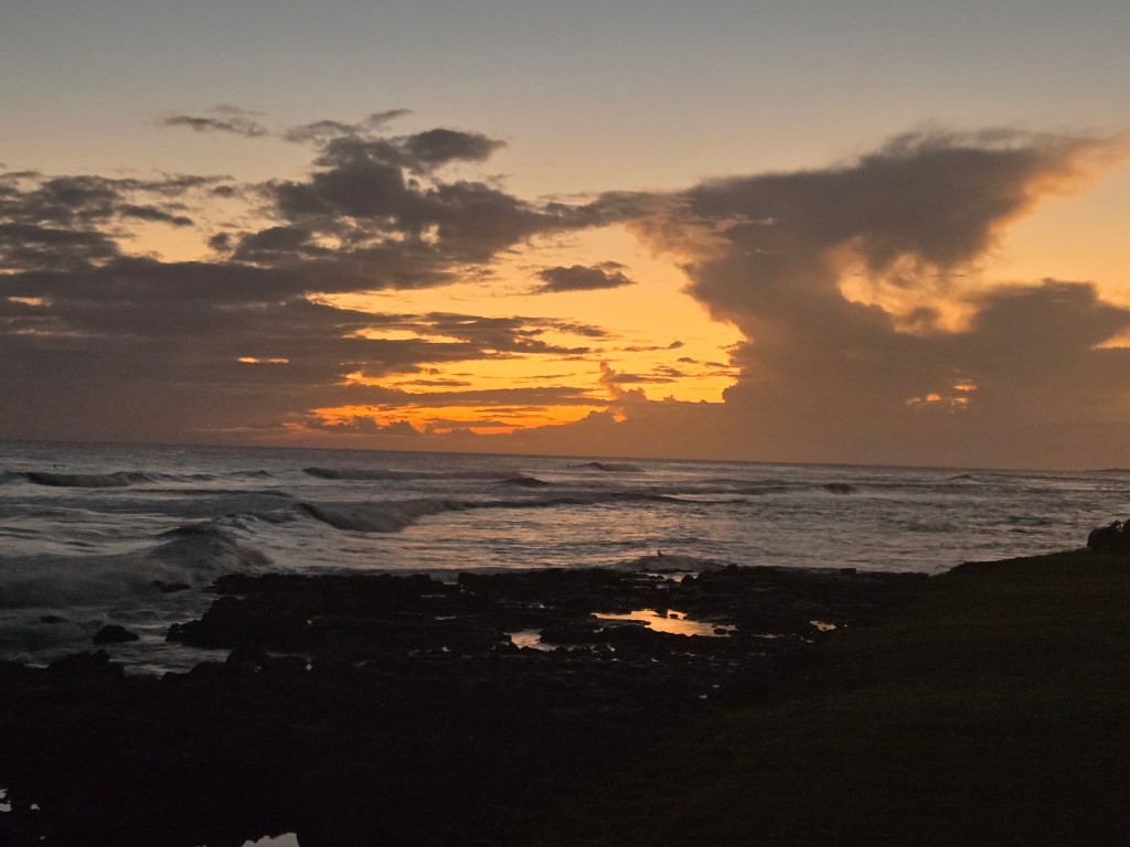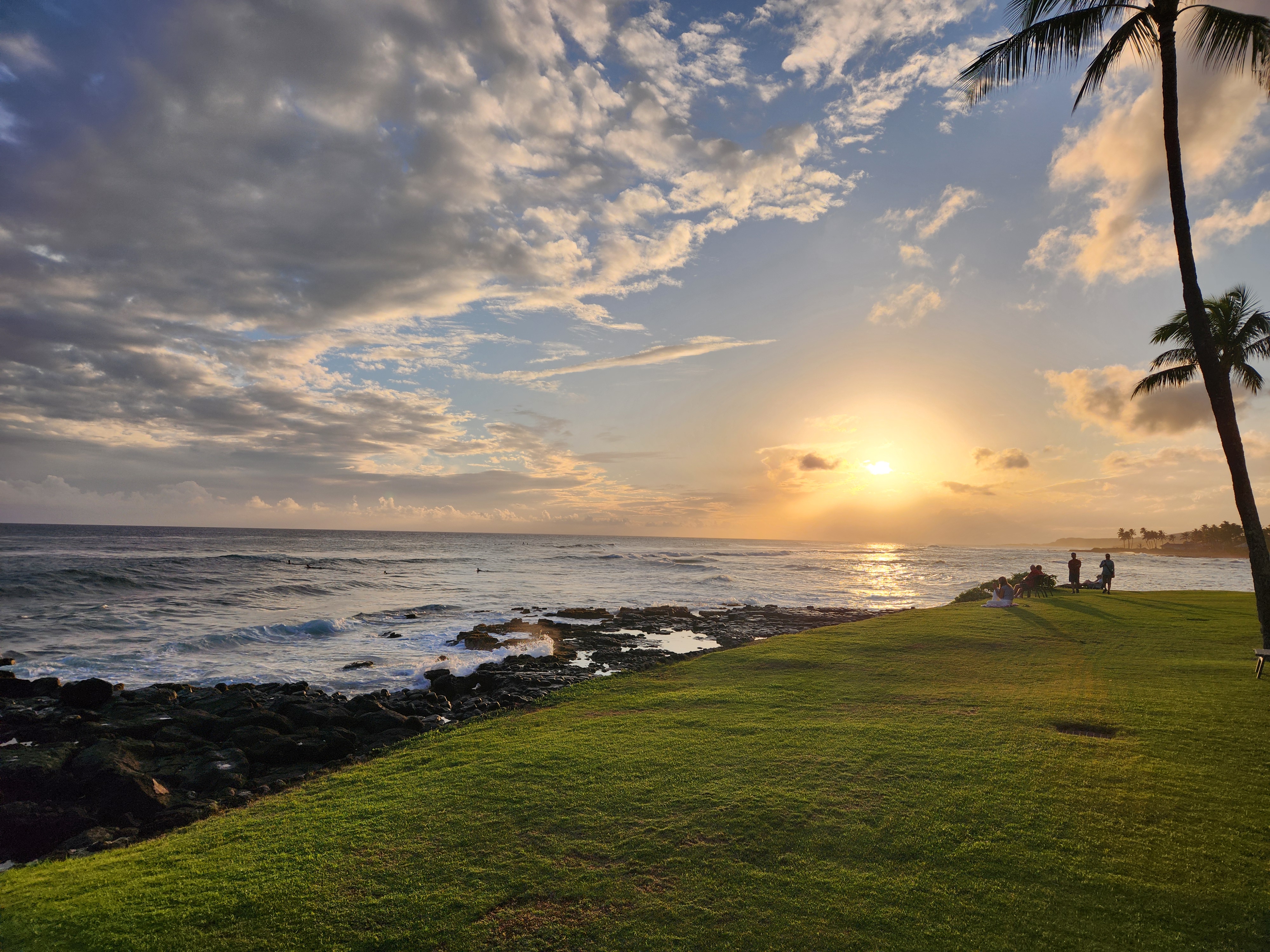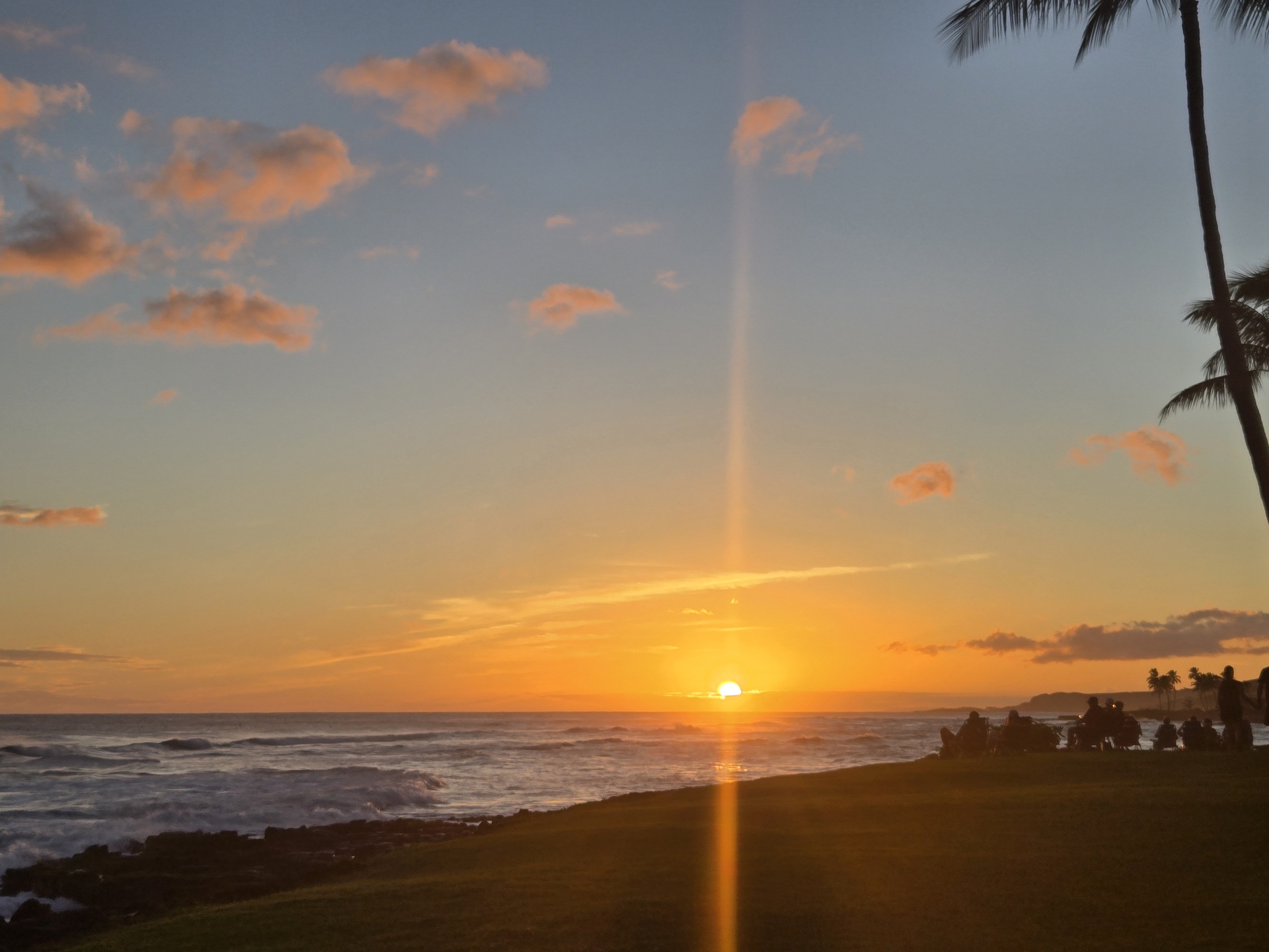 One of the first sunsets we witnessed in front of our Kauai home.  It was so fun!  Fellow Kuhio Shorites would set up their beach chairs, drink beverages, converse and watch the sunsets. We never had a blah eventide