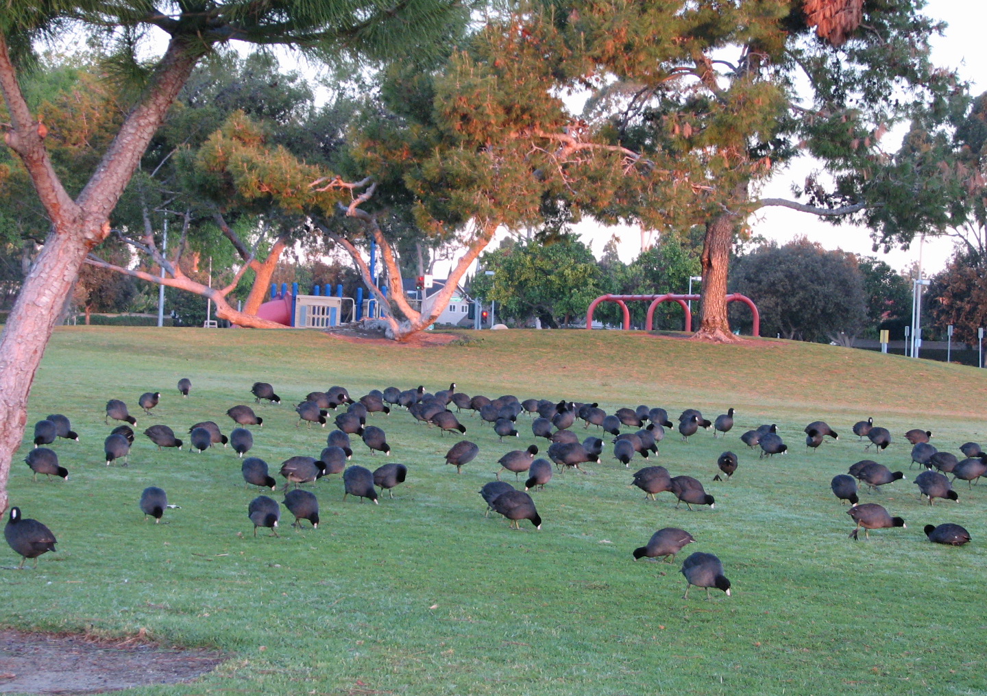 had risen higher. Well, I couldn’t wait that long and so I’ll just have to rust that this really happened. I don’t know if it ever does because I’ve never seen an article in the newspaper or online about this little piece of trivia. The smallest piece of Water Henge represent an 11,000 year drought 10,000 years ago. And we think we’re in a drought now after a year or so! After being a bit disappointed in not seeing the sun shine, I continued my walk around the park and took a picture of a large flock of coots (what Dad used to call mud hens). They were “grazing” on the grass, probably leaving their evidence everywhere. Those birds are really messy!