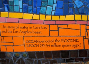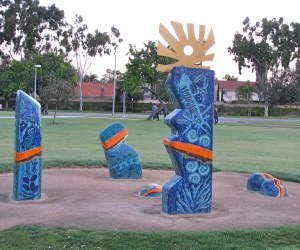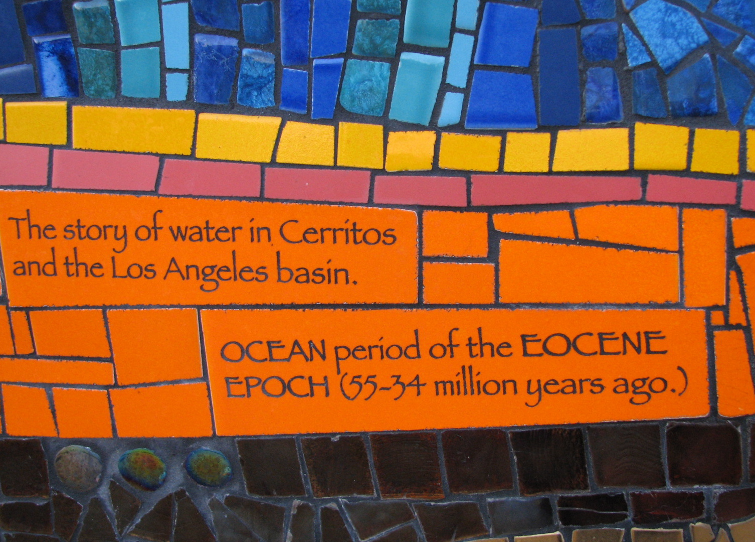 On the first day of spring, I walked over to the Cerritos Regional Park to check out “Water Henge: H2O = Life,” a sculpture near the community pool. Cerritos has many sculptures throughout the city, but this is my favorite because I can understand it. It’s also different from all the other sculptures in Cerritos because of its composition is of Expanded Polystrene (EPS) that is coated with one” thick cement. Ceramic tiles accented with glass pieced surround the cement. The piece was commissioned by the City of Cerritos and Los Angeles County and was created by artist Kim Emerson. The artwork is made up of five mosaic landscape sculptures that represent a visual timeline of the presence of water, or lack of water, in the region. The pieces range in size from 9 inches high to 15 feet high. The tallest piece has a part on top that looks like the sun and the sun is supposed to shine through the hole onto the smallest piece on the first day of spring. This is why I went over to see it. But I didn’t think far enough ahead and failed to realize that I had to wait until the sun