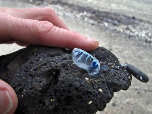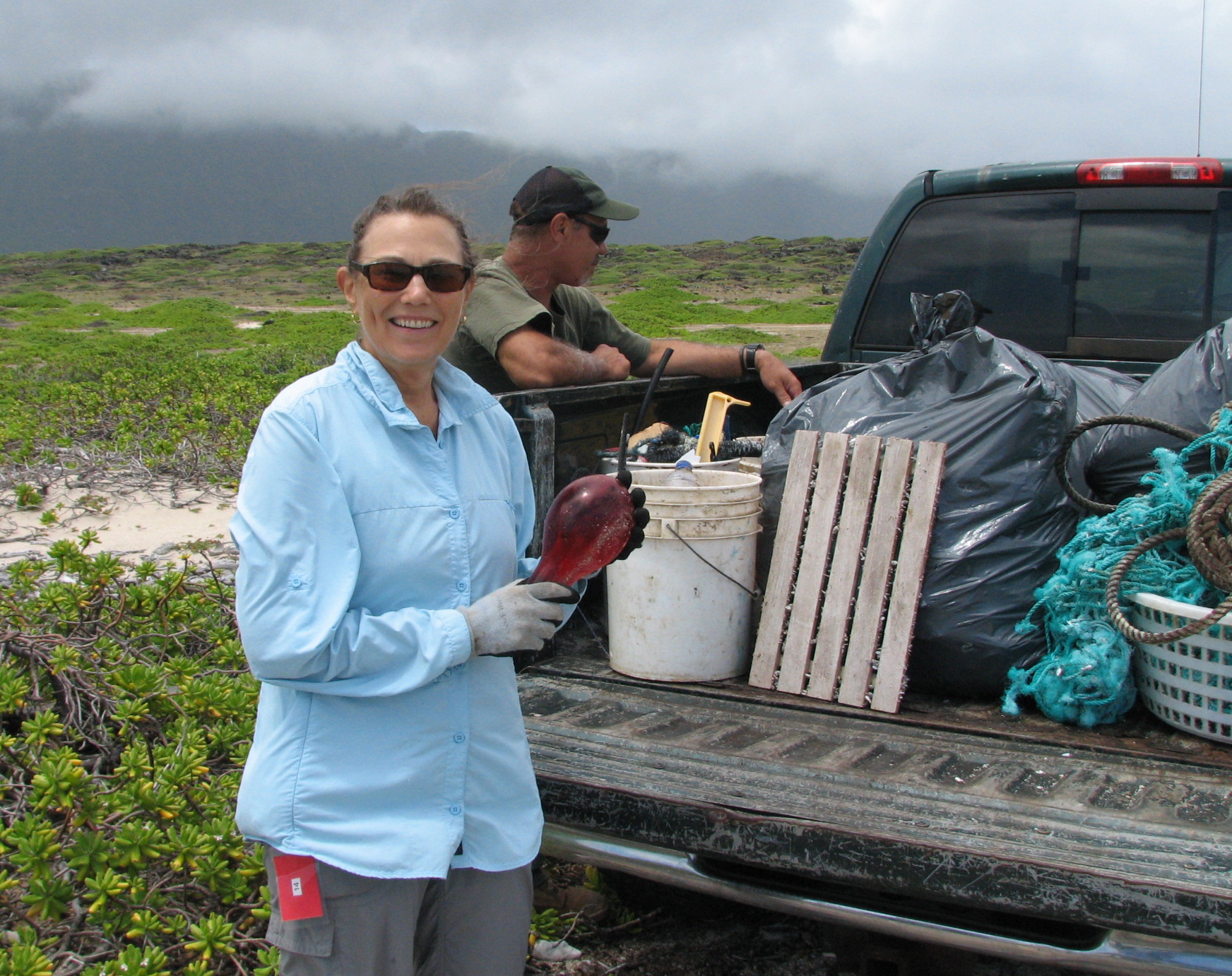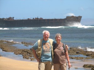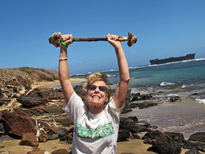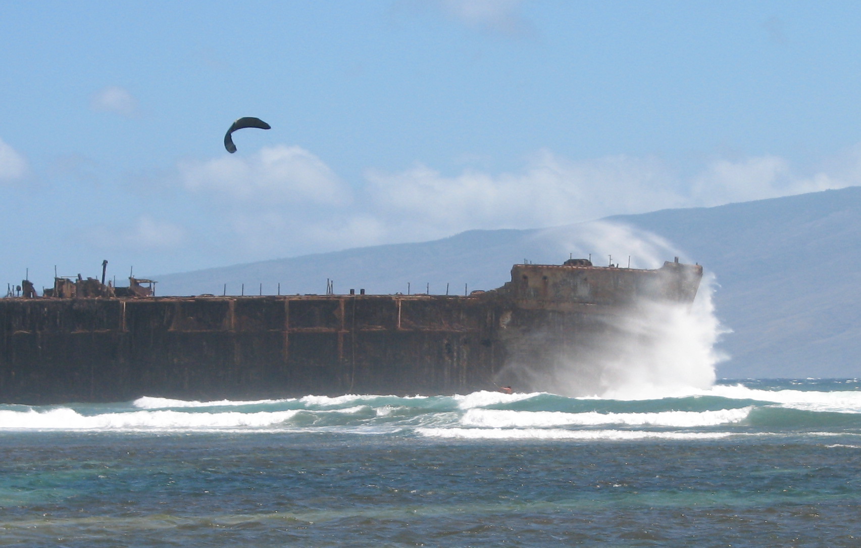 Moloka’i and Maui, directly onto Lana’i’s north shore. Vessels emerging from the wind shadow in either direction encounter sudden gusts and rough seas. The more than six mile stretch of coastline gives one an opportunity to see all kinds of flotsam and jetsam as well as actual wrecks still being pounded by the currents and waves. We hiked about a four mile round trip and were tired from being constantly windblown. But it was a great day and I enjoyed every minute of it! The first actual wreck one sees is the YOGN-42, an old ferro-cement navy fuel barge, abandoned about 1950. We don’t know the reasoning of letting it run aground in this location. But it’s great for picture taking. Later, we noticed a wind surfer spending a lot of time near the old barge, apparently having a great time. We were entertained for a long time checking out old timbers, other wreckage, sea salt deposits, shells and critter tracks (such as deer and turkeys).