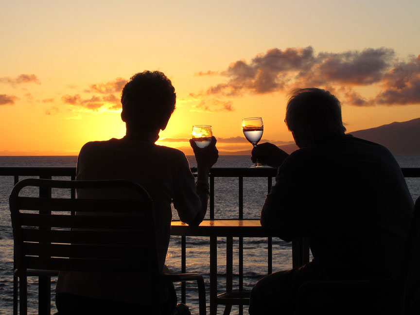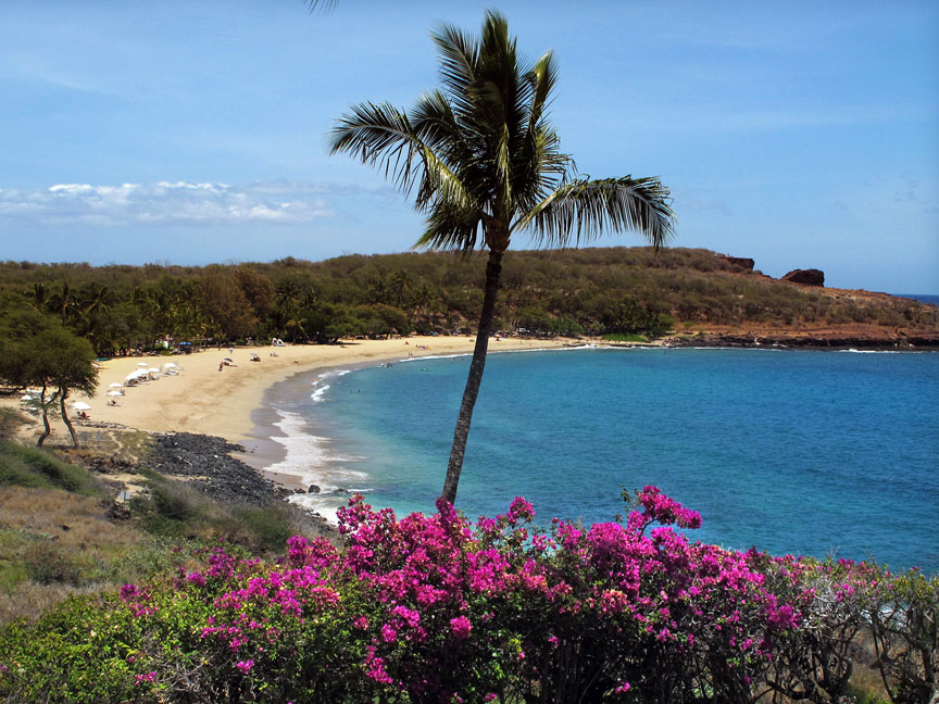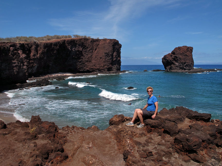 reason, we didn’t have any problem adjusting to the cultural change. Jan and Dick greeted Mike Carroll, a Lana’i artist they had previously met, who was painting in the lobby of the hotel. It was fun to hear the chat. Lunch was fantastic with a view to match. It made the three of us feel like royalty. We hiked around Hulopoe Bay and checked out where Bob and I had spent