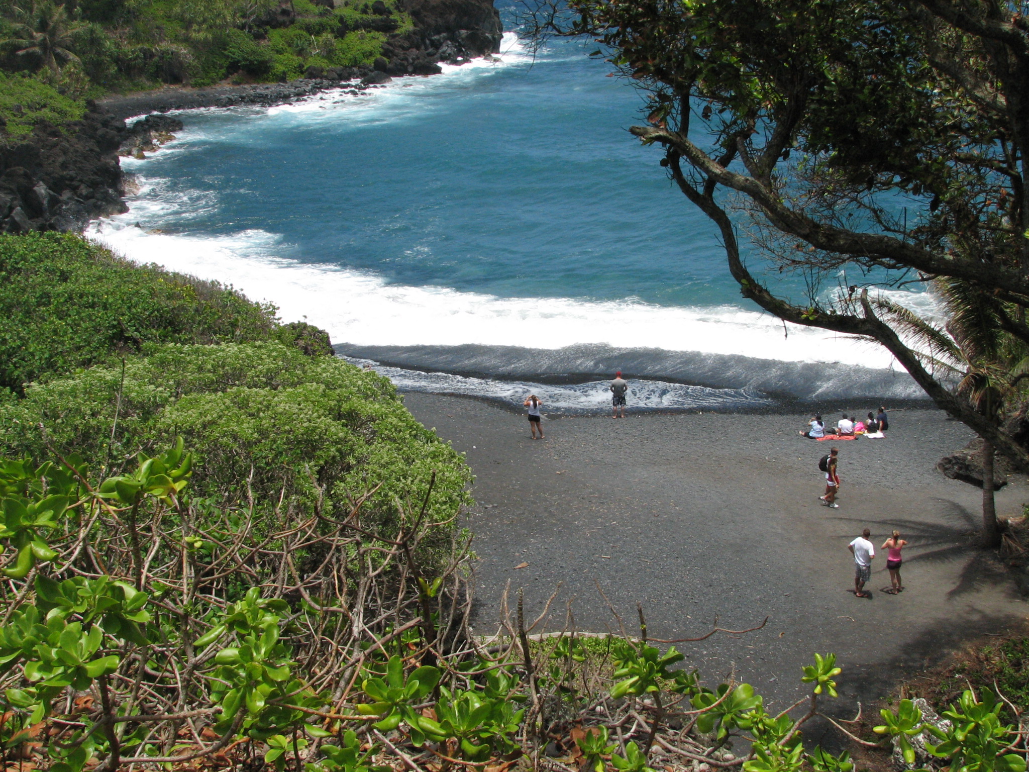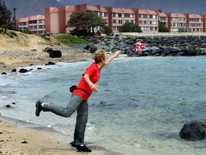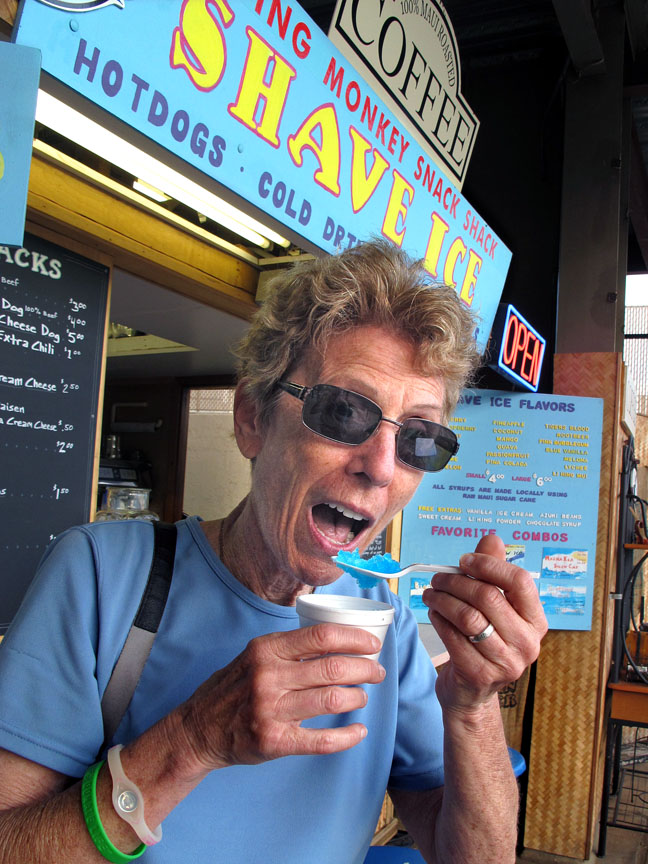 The rest of our adventure that day included visiting a Buddhist shrine honoring Japanese workers killed by a plague in 1900 and the remnants of the “Trilogy Club,” a sort of day camp that a tour group brought tourists from Maui to spend the day swimming, playing on the beach and eating treats. The next day, we treated ourselves to the Blue Ginger’s apple turnovers and rode out to Kaiolohia, aka Shipwreck Beach. Strong trade winds are funneled between the island of