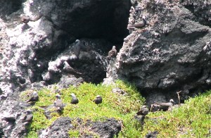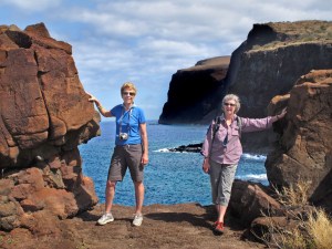Kahekili’s Leap (also known as the Warriors Leap. It is a natural platform 63′ above the ocean and Kamehameha’s elite warriors would prove their bravery by leaping into the ocean. Made my stomach turn to look over the edge. But then, heights scare me. Jan and Dick told me that Dick often gets his hair cut in novel places on some of their trips. The new place on this trip looking out on the bay at Kaunolu with the “stacks” in the background (“stacks” being a unique volcanic structure).