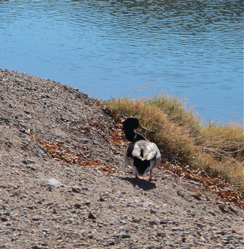 My last day there, we drove to Willow Beach, a nice campsite for tents and trailers (but with no shade, unlike Gale’s place with lots of trees) and a nice beach.  It’s below Hoover Dam a few miles.  Sissy was excited because she got to chase some mallards and even go for a swim in the cold water (about 55 degrees or less).  We had a nice picnic lunch and watched the river flow by for a while.  A mallard tickled us when he would cock his head, lean to the left and sit that way for several minutes.  Then he would cock his head, lean to the right and, again, sit that way for several minutes.  We never did figure out why he did this.  My friend, Dick, suggested he was posing for the lady mallards.  Who knows?