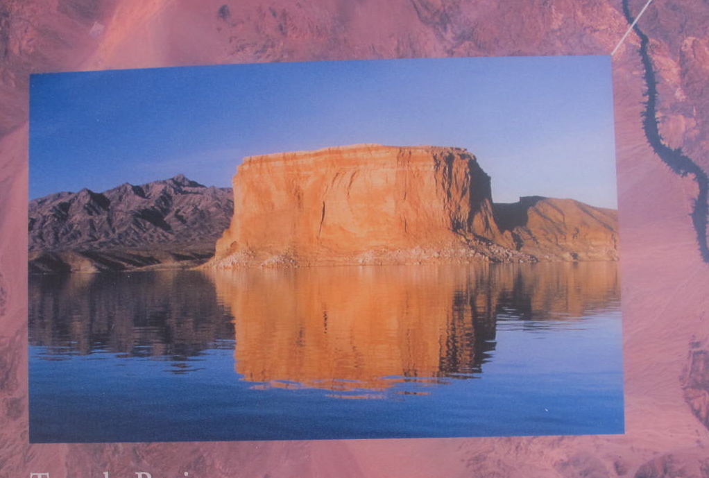 from which we could take pictures, experience the coolness of tunnels inside the vast dam,  see marks on the walls that engineers used to get things just right and some graffiti from dam workers.  Hoover Dam is 726 feet high and contains 3.25 million cubic yards of concrete.  This massive project was begun in 1931 and the last concrete was poured in 1935…two years ahead of schedule and well under budget!  (Can you imagine a comparable project finishing like that today?)  Lake Mead is formed by Hoover Dam and has a shoreline of 550 miles.  When full, its length is 110 miles.  Sadly, it is not full now, primarily because of an increasing need for water throughout the Southwest, drought and poor snow falls.  When Gale and I were at Gregg’s Hideout, we could see a waterline that appeared to be at least 90 feet above where we were.  The low water level can be seen from the air and ground.  I liken it to a bathtub ring