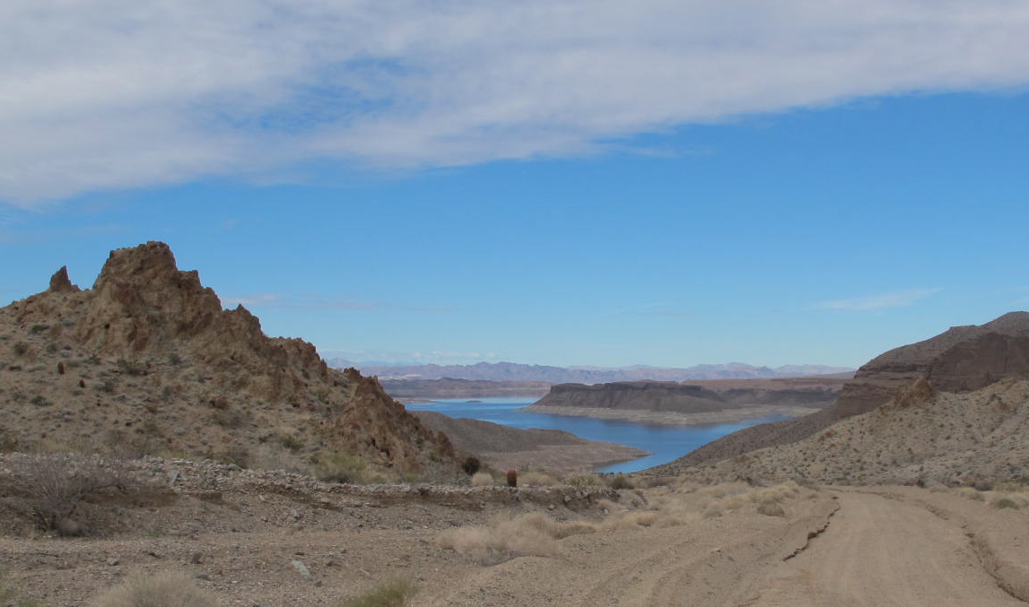 A dirt road going west from our road back to Temple Bar beckoned us that afternoon.  A sign said “Wilderness Area” and we thought that sounded like a good adventure.  The “road” climbed steadily for a couple of miles before it ended in a small parking lot.  I put “road” in quotes because Gale had to use her 4 wheel drive in a few sections that had been washed out and it was pretty rough for a bit.  A hiking trail led to the Mt. Wilson wilderness Area from that little parking lot.  But the real reward was when we turned around to look at the road below us.  It was pretty clear and we could see for what seemed like forever.  I’m pretty sure we were looking at the White Hills, the Grand Wash Cliffs and points beyond.  We were never able to figure out if we could actually see the southern end of the Grand Canyon, but I would like to think we could.  If not, I think we could see almost to the end of it.  Whatever, the hills and mountains were multihued just as they are in the Canyon.