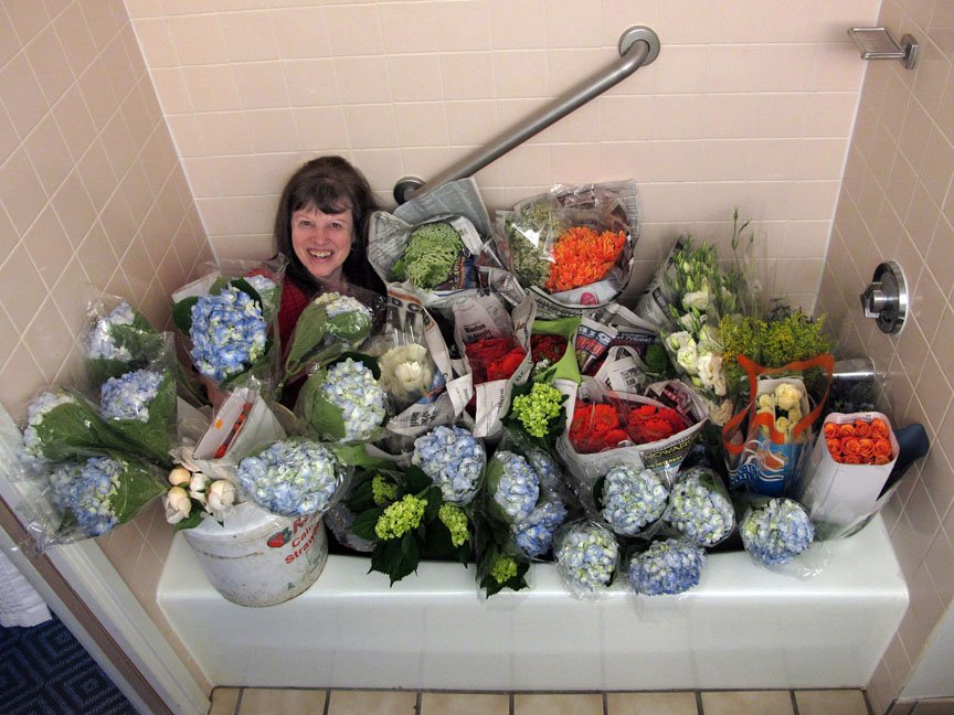 Where was Connie? I’m not sure. When we left her at the Doubletree Hotel, she was amidst hundreds of blossoms in the makeshift floral repository(aka the shower). I know those flowers were stripped and prepped for manipulation into gorgeous creations and Connie was pretty tired that evening. I assume the wedding went off without a hitch…oh wait, they were getting hitched. So I guess there was a hitch.. Anyway I haven’t heard anything to the contrary. Connie created a wonderland for the bride and groom and I know the wedding was wonderful and will be remembered by all.