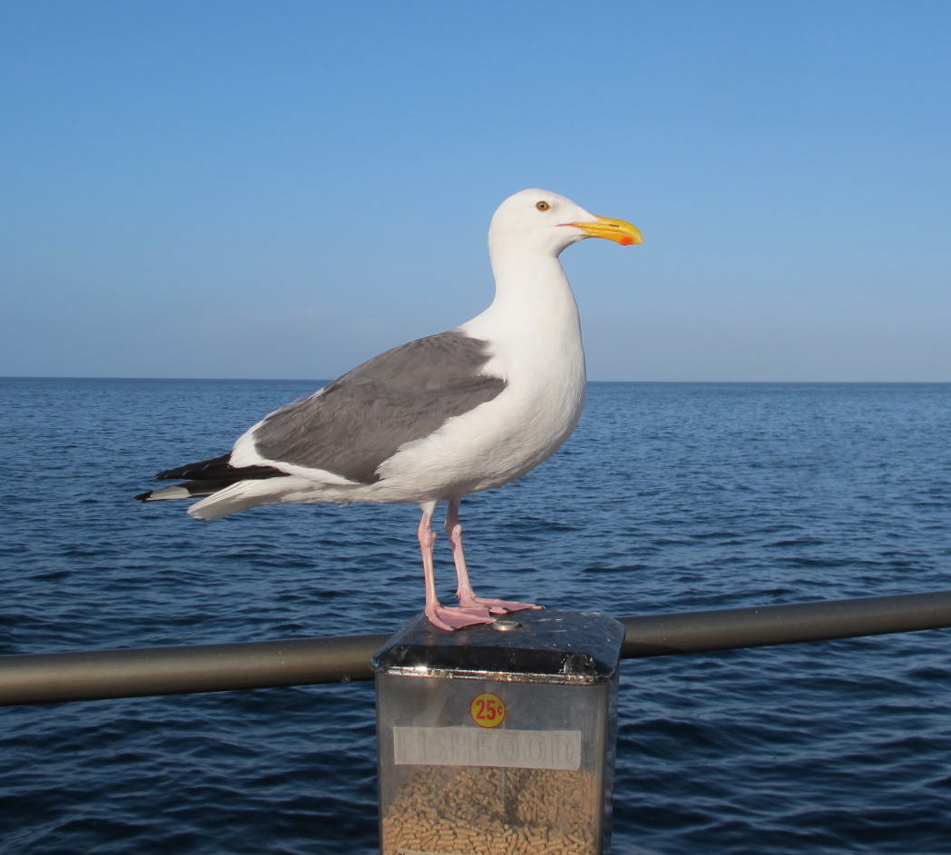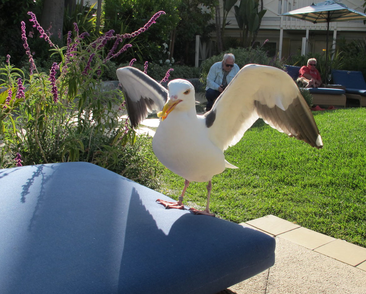 main street ,which is right on the beach and it became cool with the afternoon breezes. So we decided to move back into the hotel courtyard where lounges were strategically located amidst beautiful flowers and other flora. There, we encountered Ben, a gentleman sea gull who loved the fine cheese we were tasting. Obviously he had done this trick before, but it was new to us. He hopped up on the lounge and watched us. Connie fed him a bit of cheese and soon he was eating out of her hand. Ironically, both Dick and I were taking pictures and we snapped the same shot from opposite angles. You notice I said Ben was a gentleman gull. He didn’t peck Connie’s hand and he hopped off the lounge when he had to poop. I thought that was very considerate as sea gulls can be very messy.