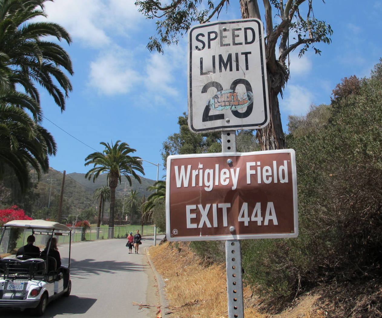 ensconced for possible heart problems. We also saw a small ballpark but not the same one that the Chicago Cubs trained at during the 20s. We walked by Bird Park, which once housed an aviary built from the steel framework of the original casino. There are no birds in it now, so it’s just a bird park in name only. One thing that struck me funny on our hike was the Wrigley Field #44A exit sign. Most of the locals (and all tourists) drive golf carts (except for buses and trucks that need to go to the airport or remote locales of the island). So there are no freeways or even wide roads, for that matter.