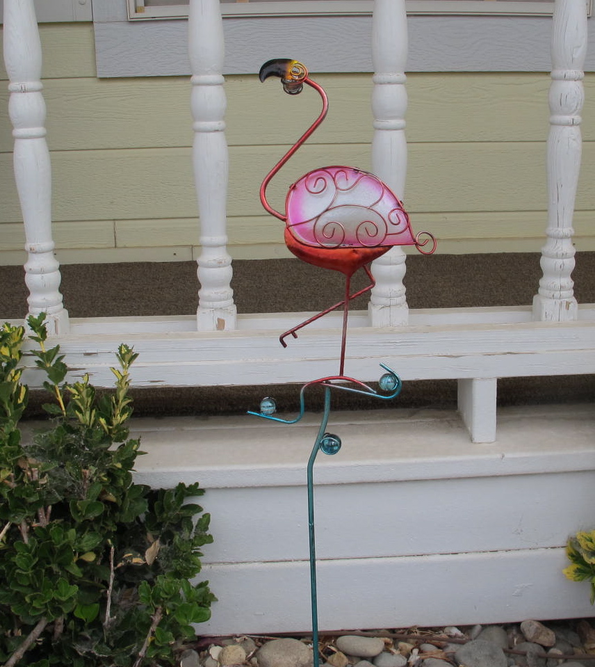 There are some new additions to the flamingo holdings that you might like to see. I purchased Ming while I was in Sacramento a couple of weeks ago and Jerri bought Curt for me yesterday while we were in Reno. Ming rides his bike in perpetuity when the wind blows and is posted next to Jay, the bluejay and the tilted birdbath that I found in some overgrown brush in my backyard. The birds don’t care and love to drink there and take baths.