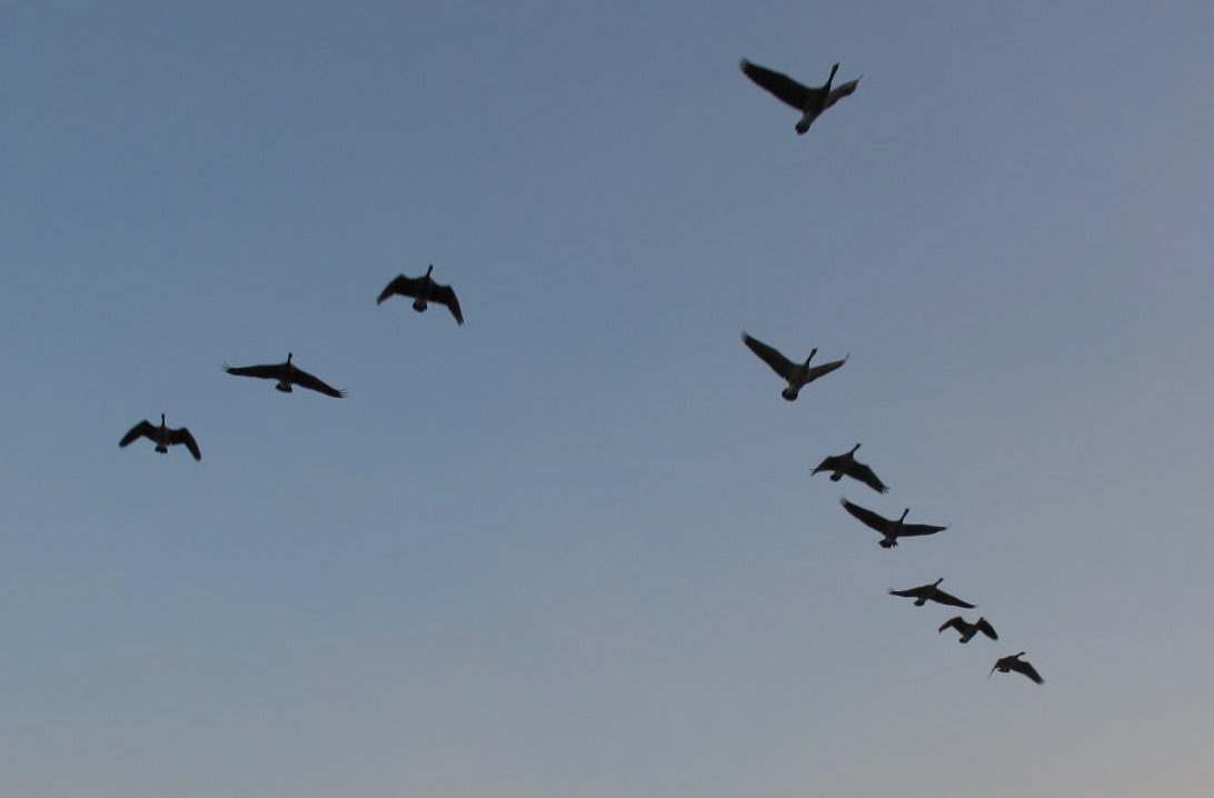 There are some settling ponds just north of my housing development and hundreds of Canada geese spend the night there. Each morning they organize themselves into family groups of anywhere from 2 to 30 birds, talk about the journey for the day