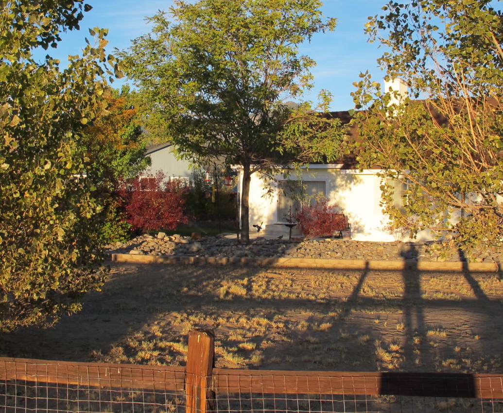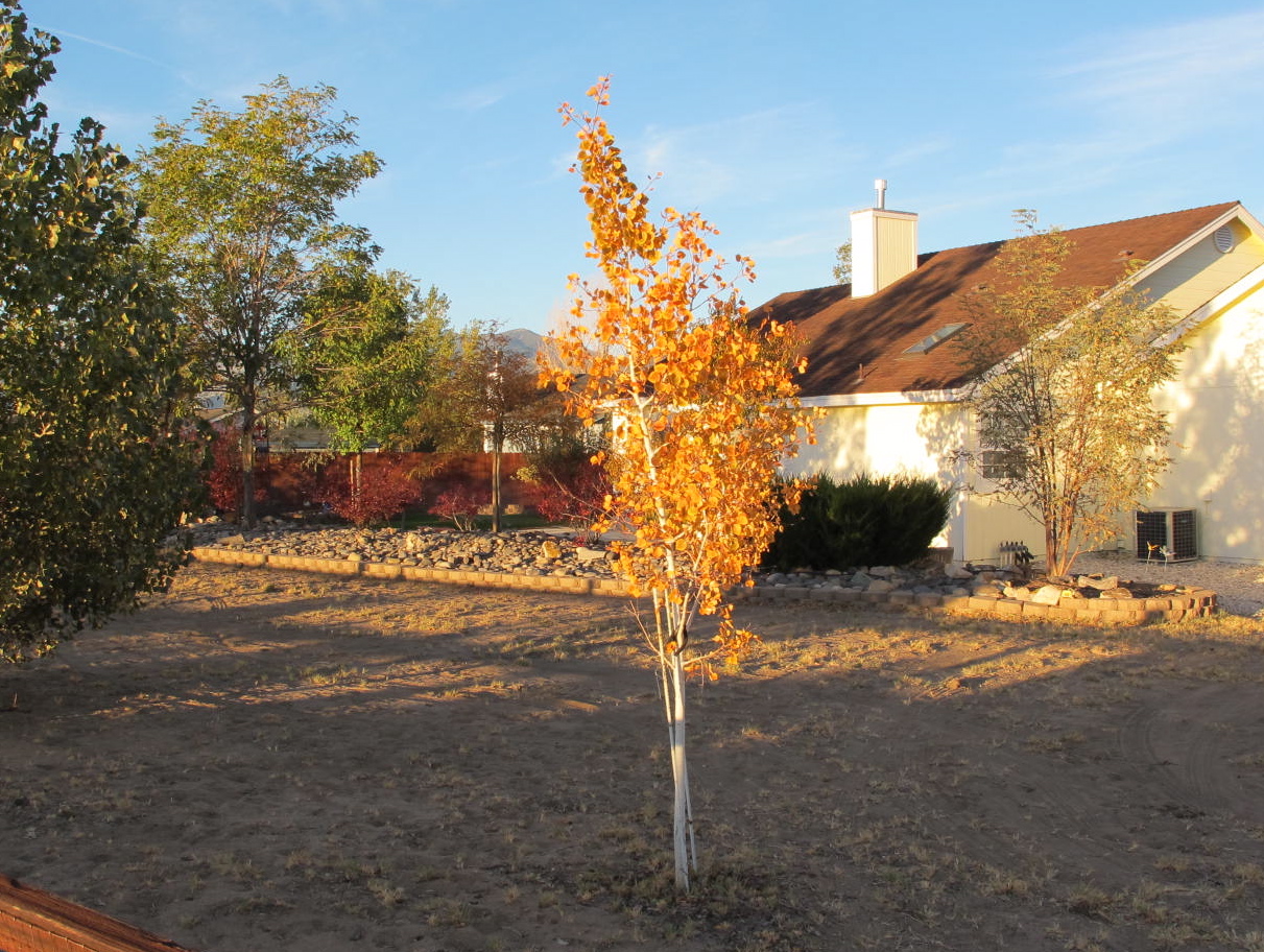 This is a little aspen in my back yard. Last week, all the leaves were a light green. My cottonwoods and other trees haven’t begun to turn much yet. Or maybe they don’t and just drop all their leaves. I don’t know yet. Check out the picture of the backside of the house. Click on the picture and if you look closely in about the center of the picture, you might see the silhouette of a quail on the rocks just to the left of the birdbath. He’s in, more or less, the bird feeding area that I have set up for all the birds. In the foreground is the fence that I stained (not real well as you can see holidays on the wood and you can also see bird poop stains since they love to sit on the fence).