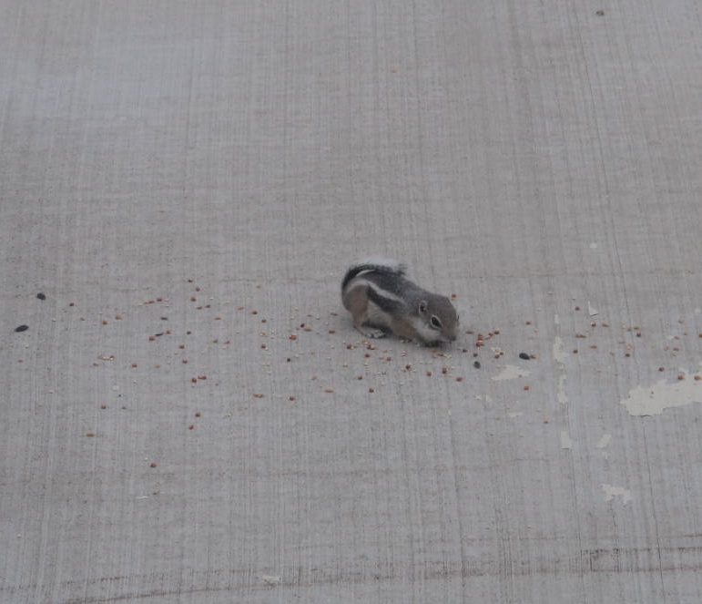 I might have mentioned Earl Squirrel previously. He keeps hanging around and last evening, I finally got a shot of him stealing seeds from the quail on the patio floor. He’s not a golden mantle squirrel but I think there is one like him at the Nevada State Museum. I’ll find out his official name tomorrow while I’m there. Earl scurries about and barges right into the area where many birds are foraging on the ground (to get at seed that the other birds spilled from the feeders). He’ll dig at some of the rocks, trying to flip them over to get at some seeds and doesn’t seem at all intimidated by birds that are larger than he. They peck at him sometimes but he just keeps on going. As long as he doesn’t bring all his cousins, I’m not too unhappy that he’s there.