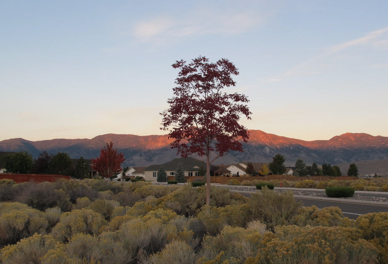 I think these trees are maples, but I’m not well versed with tree names. They are planted along the open space trails upon which I take the morning walks. When the sun hits them, they seem to become a brighter red.
