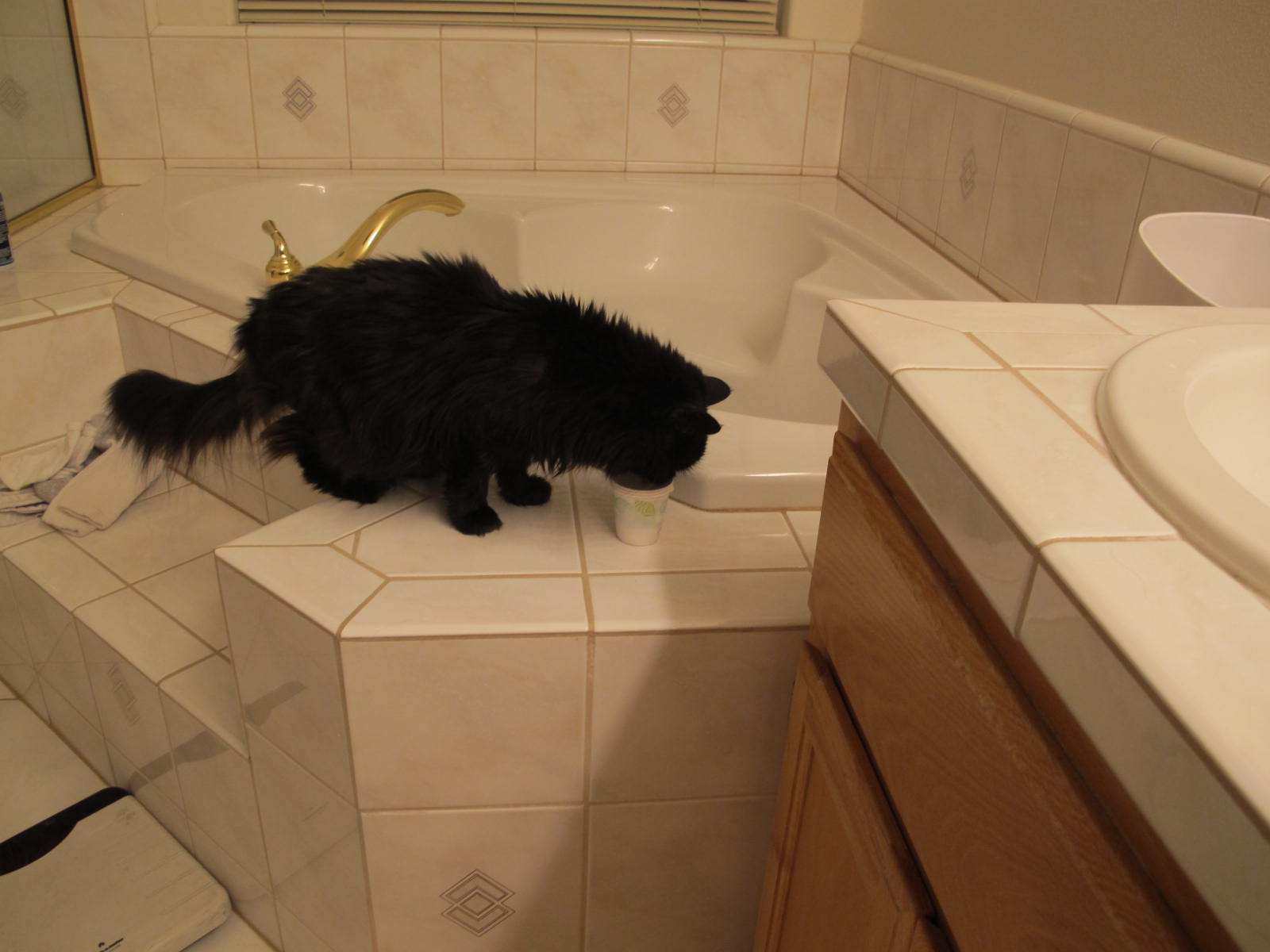 I also wanted to share with you, BC’s new trick that she does on the rim of the bath tub. She’s gotten into the habit of jumping up on the rim and then wanting to get up on the counter while I’m brushing my teeth to get a drink out of the sink. Why she does this, I have no idea because she has water dishes all over the house. So I’ve taken to filling little Dixie cups and she drinks them down about half an inch. Then she looks up at me as if to say, “More?” So we go through this at least one more time if not more. My cat is a goofball!
