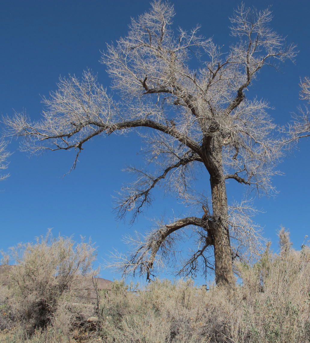 This stately old cottonwood will leaf out in another month and bring much needed color to the area. John C. Fremont took samples of this tree back east with him and, since it was a new species of cottonwood, it was named after him.