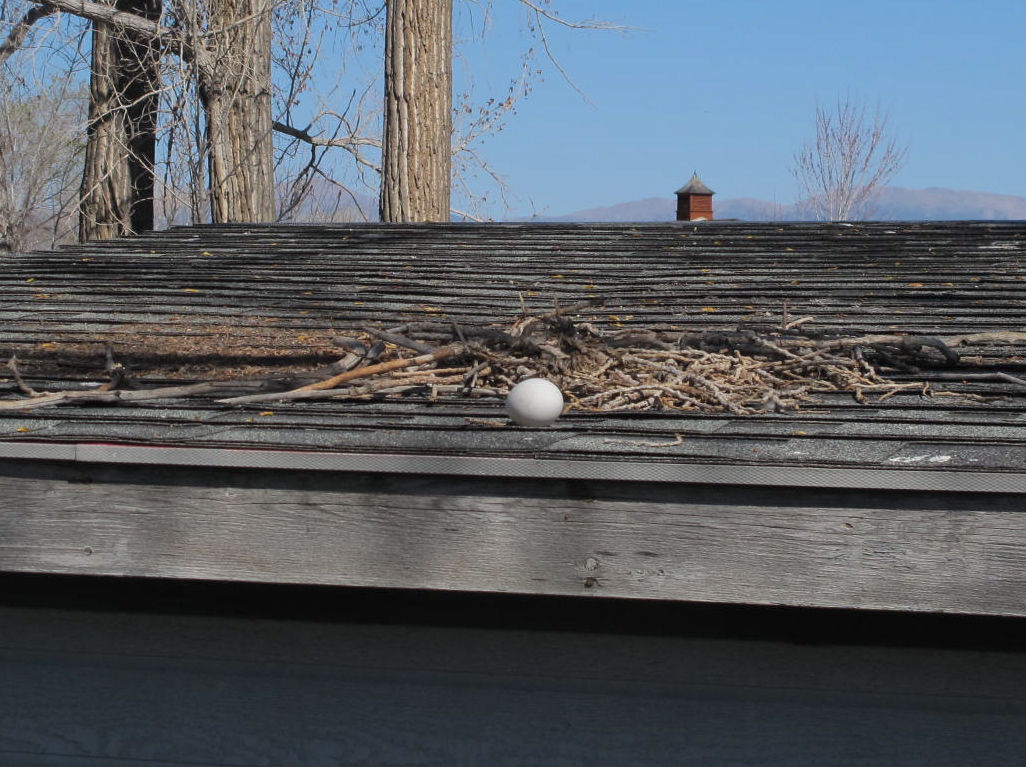 For those of you who don’t know Diana, a life long friend all the way back to Kindergarten, I need to tell you that she owns Quail Cottage, an antique shop in downtown Gardnerville. She told me about a pair of Canada geese that had recently been building a nest on top of an old shed on the property in back of her shop. She said the female was working hard, collecting twigs, putting them on the roof of this shed and sort of scraping the twigs together with her foot while the male stood around and watched her. Anyway, when Diana took me home, we stopped by the shop to see if the goose was sitting on her nest. What we found was a little pile of twigs with an egg outside of the “nest” and no geese to be seen. Even though these geese are supposed to mate for life, we think this might not have been a successful relationship and they abandoned the nest and maybe each other. What happened? Inquiring minds want to know!