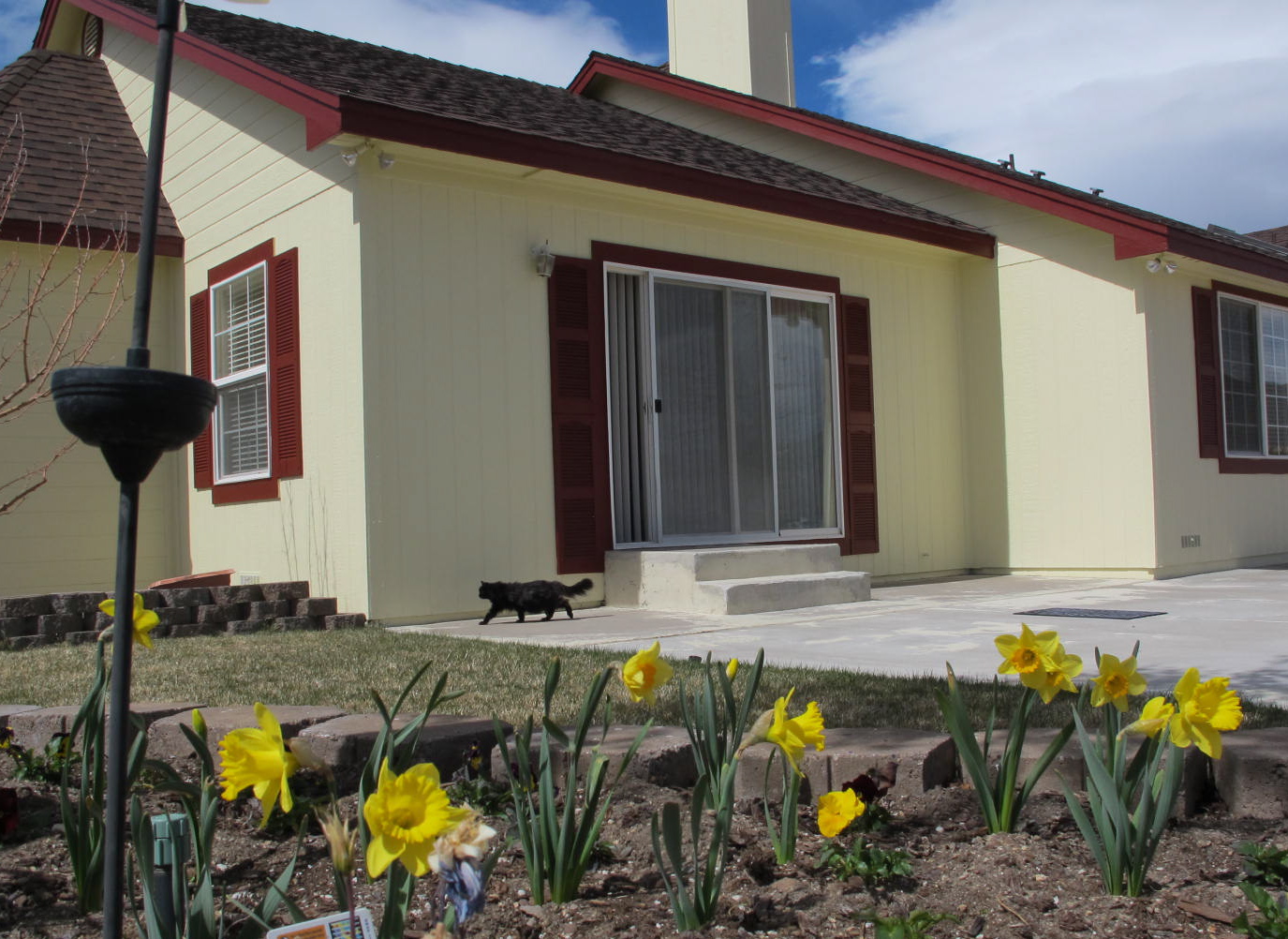 As soon as the weather is better and not dipping below 32 degrees at night, I will be planting some colorful plants and posies around the house and in the back. I do have some daffodils, pansies and columbine in the backyard, but that is about all I can put out for the time being. The mantra is here to not plant before Mother’s Day because of the weather. It is a whole different ball game up here and I’m learning new ways to garden very quickly. I’m pretty happy with the way the house turned out and how fresh it looks. I copied the color from a house a few blocks away and their house looks terrific even after 8 years of being in the harsh Nevada sun.