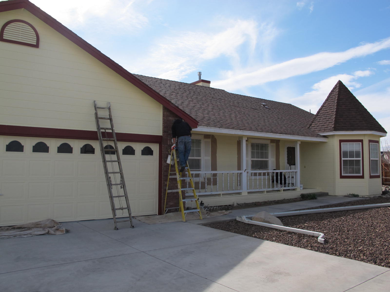 The colors that I chose are called French Sonnet and Sequoia Red. I thought the Sonnet was more like a cream with some yellow in it, but it’s more yellow than I thought. This is a shot of the house with the new body color on it. Note the contrast of color between the two garage doors. The pale color is the old yellow. The painter did that on purpose to let me know what the contrast was.