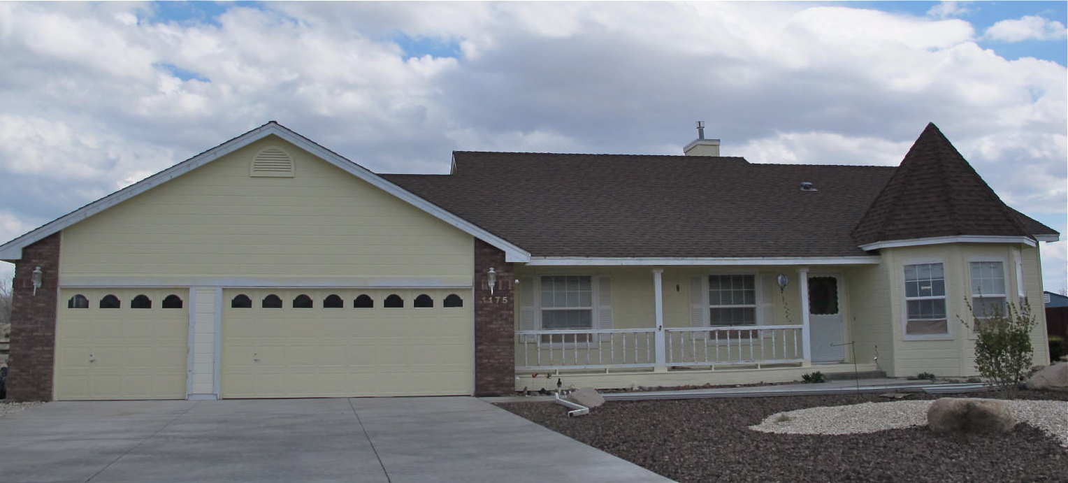 The above picture is to refresh your memory as to what it used to look like. Please note the lawn to the right of the driveway. It is no longer there. Due to high water prices and the drought, I decided to take it out and install some red rock to tie in with the reddish roof with a white rock island in the middle. You might notice some green stuff to the left of the picture. Those were ugly, scraggly dwarf fruit trees and they are no longer there. Drought resistant foliage will be planted there as soon as the weather gets better.