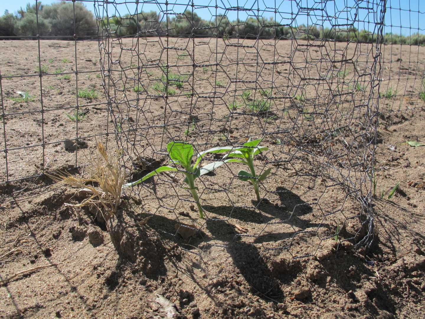 Then Jerri suggested planting more sunflowers along my back fence. “They would be so pretty waving in the wind,” she said. That sounded like a great idea and I did that. Again, I watered dutifully (there is no drip system along the back fence) and waited for the little plants to break through the surface. Soon I saw results and soon most disappeared. I was able to put wire around some of the plants and they are growing.