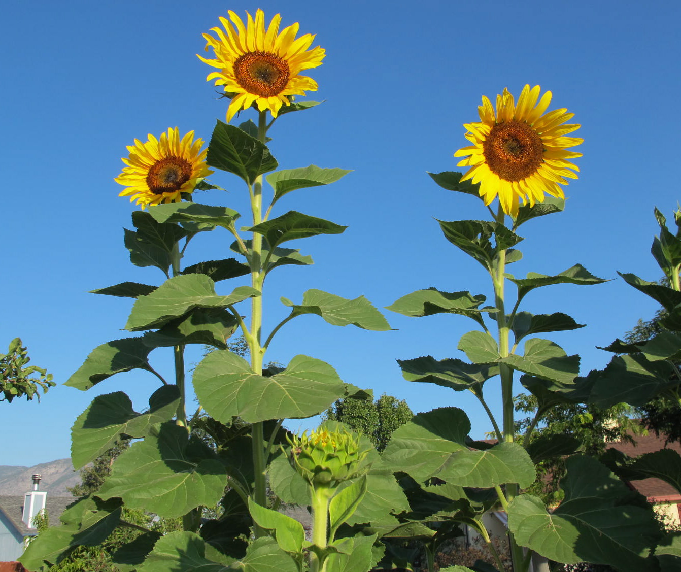 You can see by this photo that they are growing tall and are beginning to blossom. These are supposed to be the type called “mammoth,” but the blossoms are not huge.