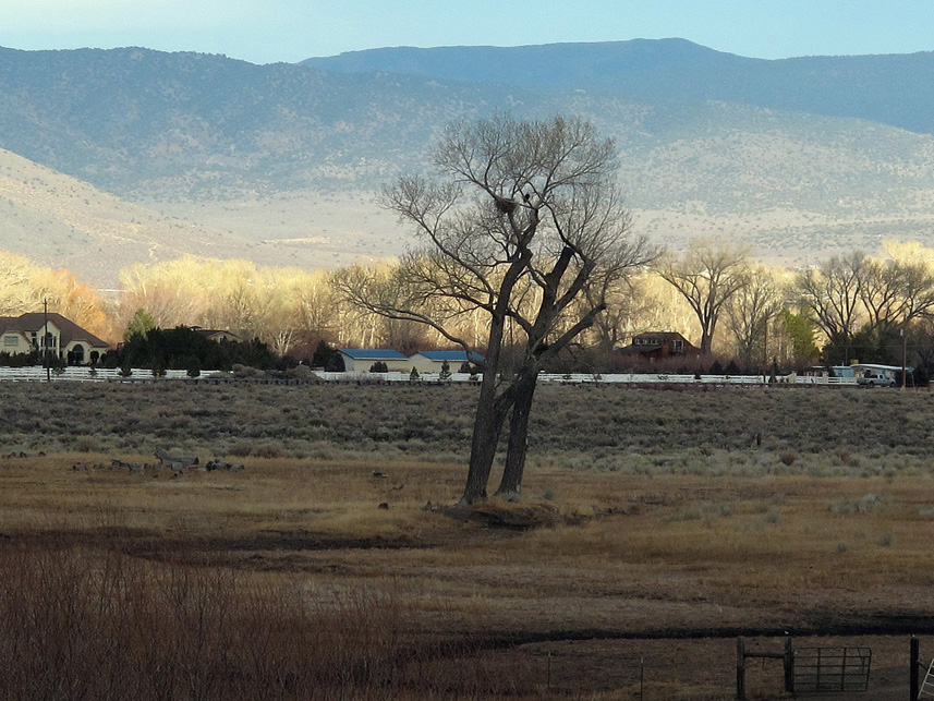 Dick arrived the day before the Fiesta and we took a ride around the Carson Valley to try to espy some bald eagles. As I reported last year, they arrive as the calving season begins. There were a few calves out in the pastures and we think we saw a couple of eagles about 200 yards away as well as a sand hill crane. No good pictures there. So we went to the Nature Conservancy beside the Carson River where I knew was an eagle aerie off in the distance. Sure enough, we did see 2 a pair of eagles. YEA! We weren’t up close and personal, but we did see them. The big clump of stuff in the tree is the nest and the dot next to it is one of the eagles. (Don’t forget that you can enlarge a picture by clicking on it)