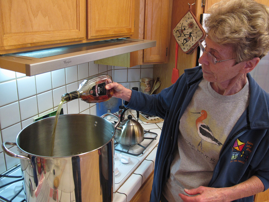 When the sauce was just right, we added the seafood and stirred some more. At just the right moment, Scott came over with his truck and carted the cioppino pot over to Jolee’s house where the Fiesta was to take place. There just isn’t enough dining area in my house for 15 people.