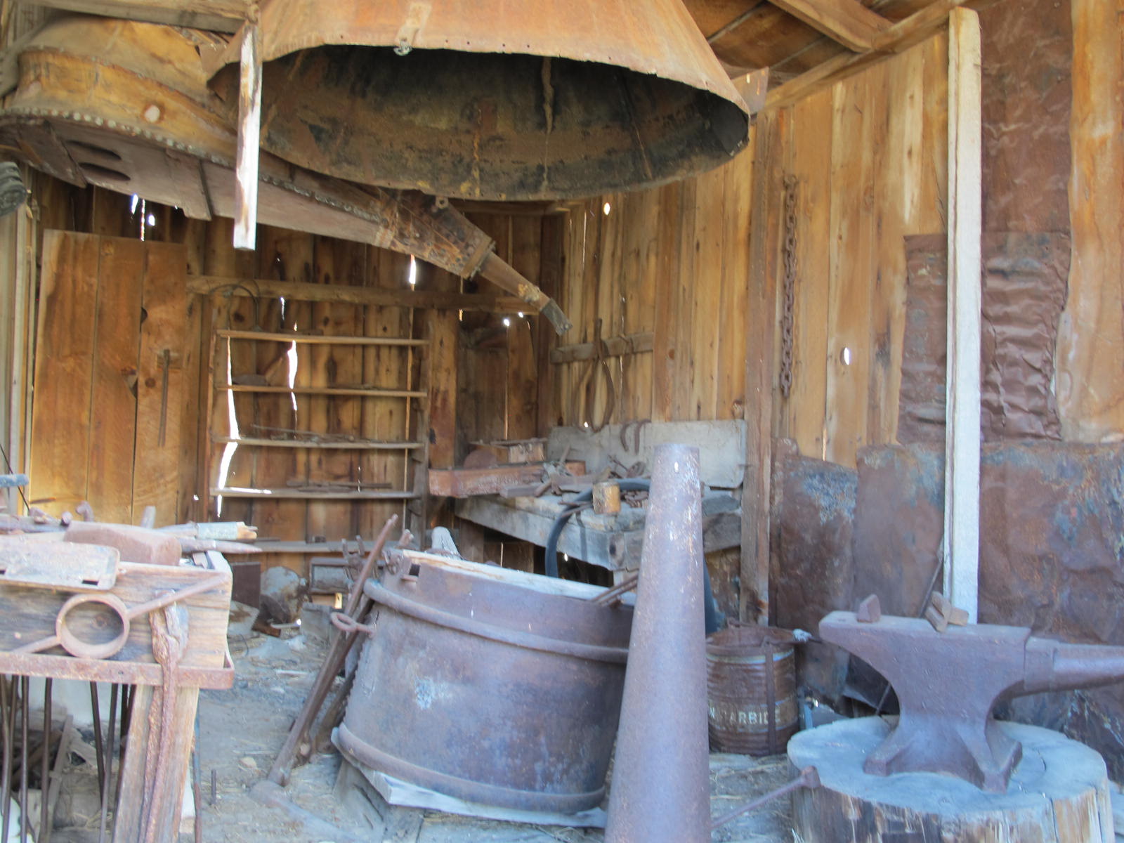 The Stuart Kirkwood Livery Stable and blacksmith shop. Note the size of the bellows behind the hood. Many wagons and literally hundreds of horses, mules and other draft animals were required to haul in tons of goods daily.