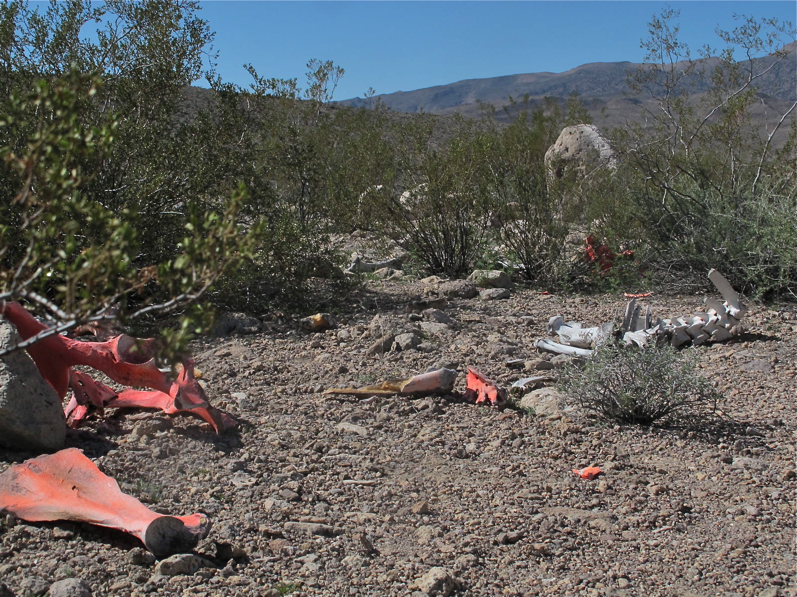 She then took me on a nice drive back into the mountains just east of Pahranagat to see what we could see on what was primarily BLM land. Mostly we saw a few cattle, some ravens, small birds and the weirdest thing was a pink skeleton of a cow or horse or some large animal. People do the darndest things. The bones were painted with a fluorescent pink paint and they were scattered among other sun-bleached bones. Actually, there were several skeletons…some pink and some white. Gale thought that someone had been butchering and just dumped the bones in the mountains, not far from the highway.